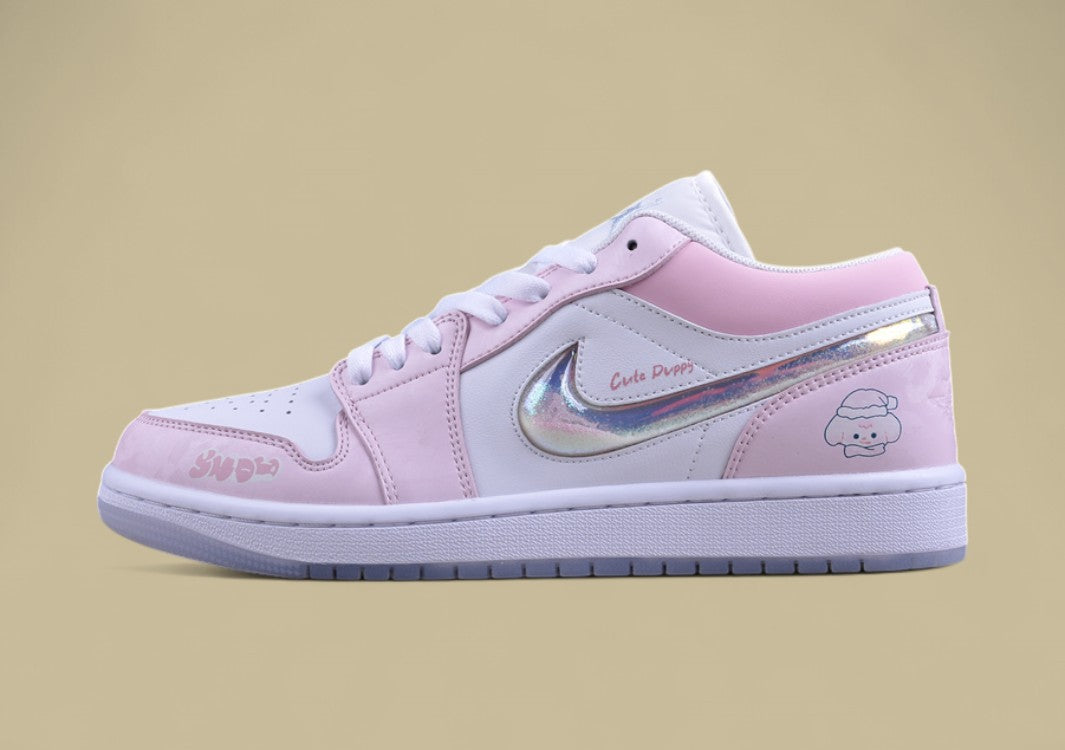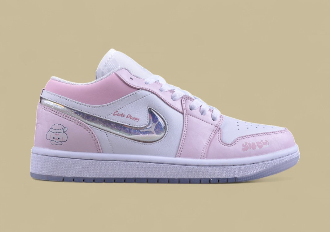 Zarter AJ1 Low in Pastellrosa mit süßer Welpen-Stickerei und Plüsch-Details.Ein gemütlicher Eyecatcher für Sneaker-Fans mit Herz.