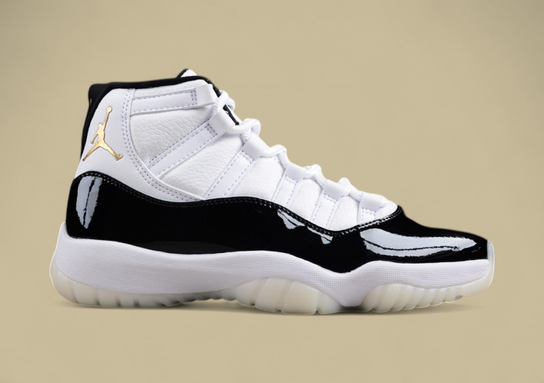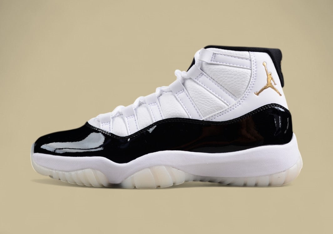 Der Air Jordan 11 "DMP" verbindet weißes Lackleder mit goldenen Details für einen königlichen Look. Ein Klassiker voller Geschichte, Stil und Siegesmentalität.