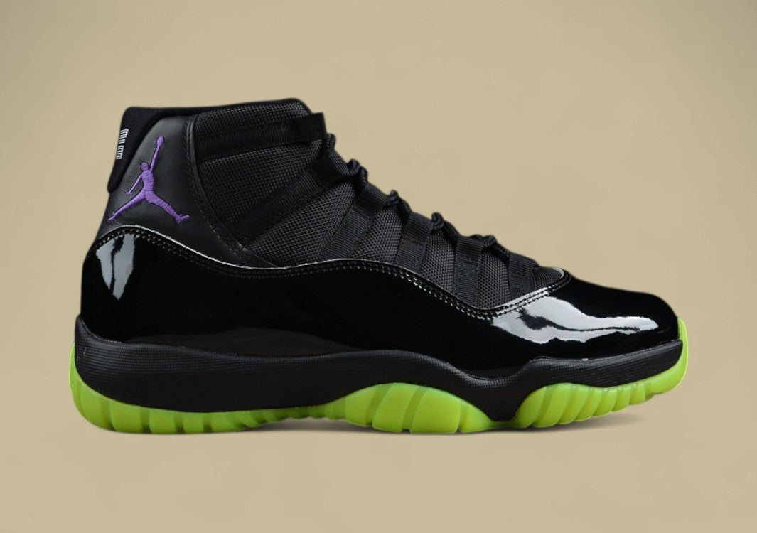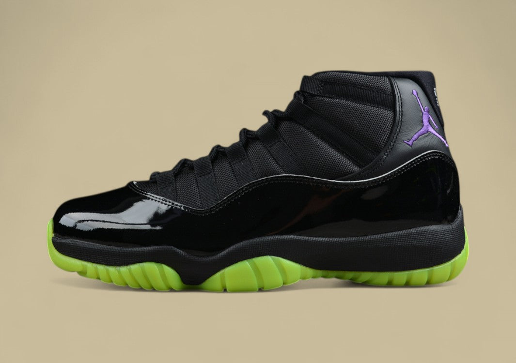 Ein auffälliger Air Jordan 11 mit schwarzem Lackleder, violettem Jumpman und neongrüner Sohle. Stylisch, sportlich und ein echtes Highlight für jede Sneaker-Sammlung.