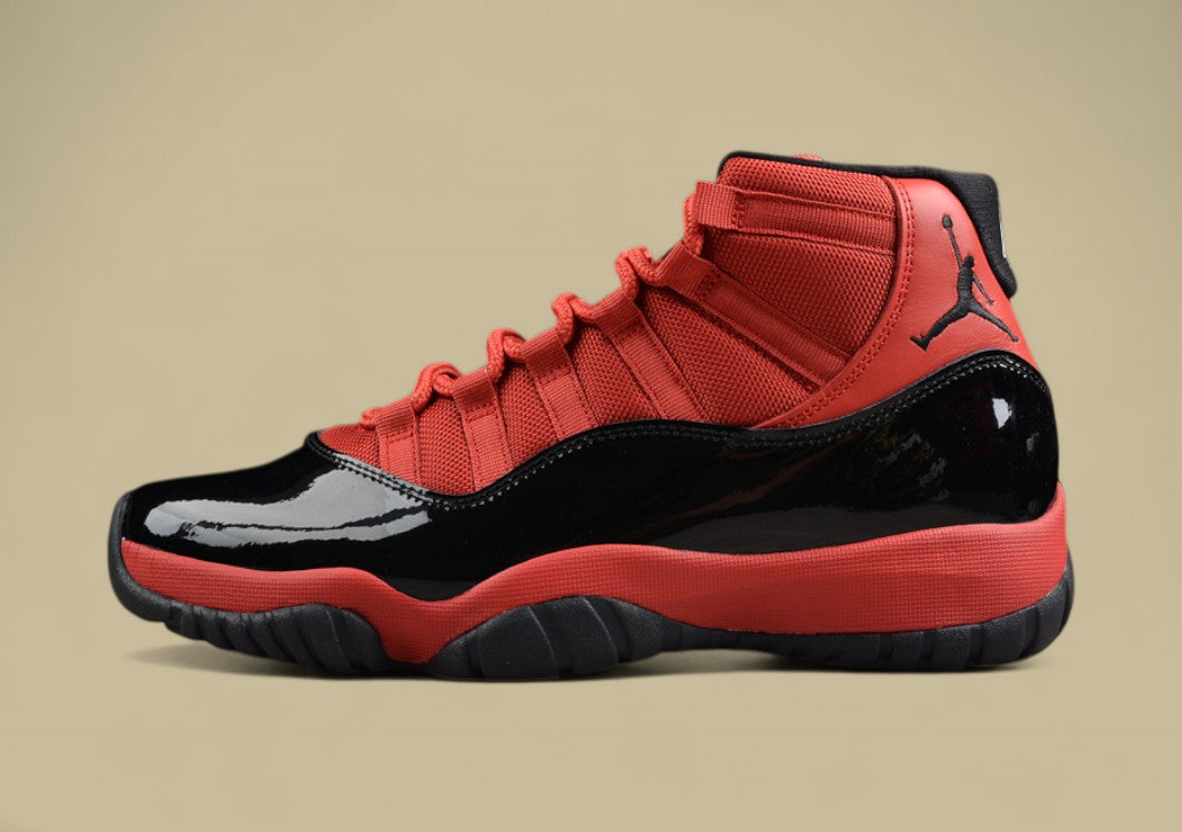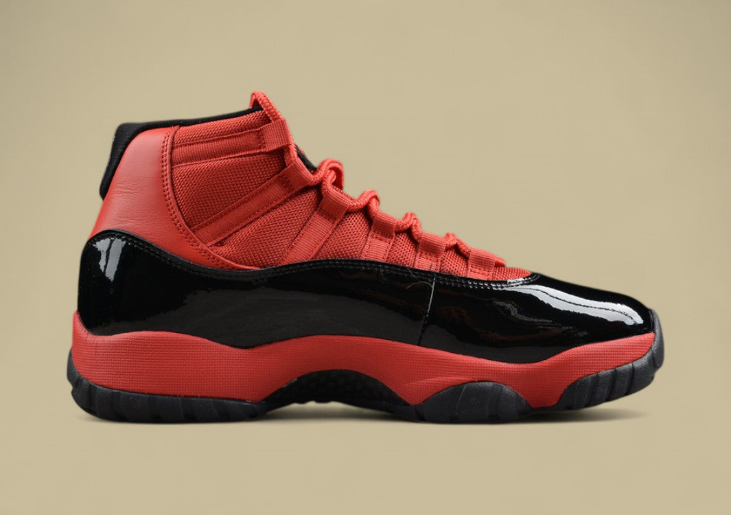 Leuchtender Air Jordan 11 in Rot mit schwarzem Lackleder und Sohle. Ein starker Auftritt für echte Jordan-Fans mit Sinn für Stil.