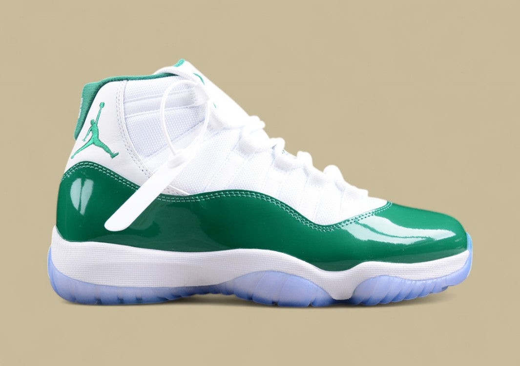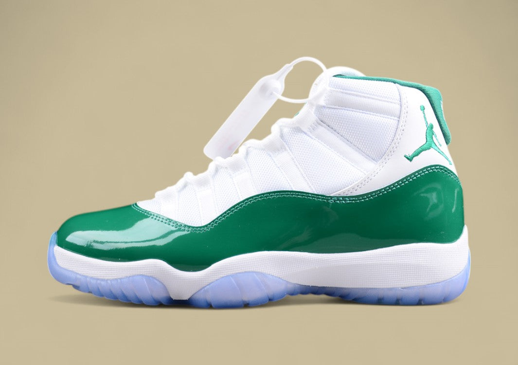 Der Air Jordan 11 Retro "White and Green" bringt frischen Wind in die legendäre Silhouette und besticht durch eine edle Farbkombination aus reinem Weiß und sattem Dunkelgrün. Das Obermaterial besteht aus glattem, weißem Mesh und wird ergänzt durch glänzendes Lackleder in tiefem Grün, das dem Schuh eine elegante Tiefe und visuelle Kraft verleiht. Die weiße Zwischensohle sorgt für Balance, während die leicht transparente grün getönte Außensohle dem Design einen harmonischen Abschluss gibt. Dezente Details wie das gestickte Jumpman-Logo auf der Seite und das „23“ auf der Ferse verleihen dem Schuh klassischen Jordan-Charme. Mit reaktionsfreudiger Zoom Air-Dämpfung und Carbonfaserplatte bietet der Sneaker nicht nur ikonisches Design, sondern auch hervorragenden Tragekomfort – ein stilvoller Allrounder mit klarer Linienführung.
