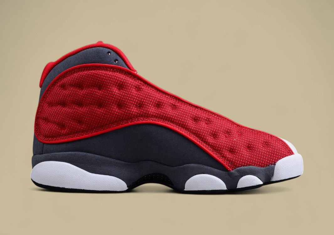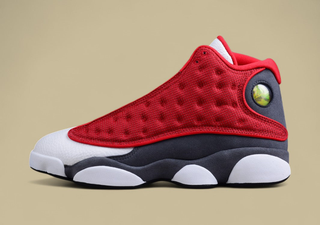 Der Air Jordan 13 "Red Flint" bringt frische Energie in die klassische Silhouette mit einer auffälligen Mischung aus Weiß, Grau und kräftigem Rot. Das Obermaterial kombiniert weißes Leder mit einem atmungsaktiven, reflektierenden Mesh in sattem Rot, das sofort ins Auge fällt. Graue Wildleder-Overlays verleihen dem Schuh eine edle Tiefe, während das holografische „Pantherauge“ an der Ferse den unverwechselbaren Look des AJ13 unterstreicht. Die Sohle im typischen Panther-Pfoten-Design sorgt in Verbindung mit der Zoom Air-Dämpfung für optimale Unterstützung, Stabilität und Komfort. Der "Red Flint" ist die perfekte Wahl für alle, die klassische Jordan-DNA mit modernem Streetstyle-Flair verbinden wollen.