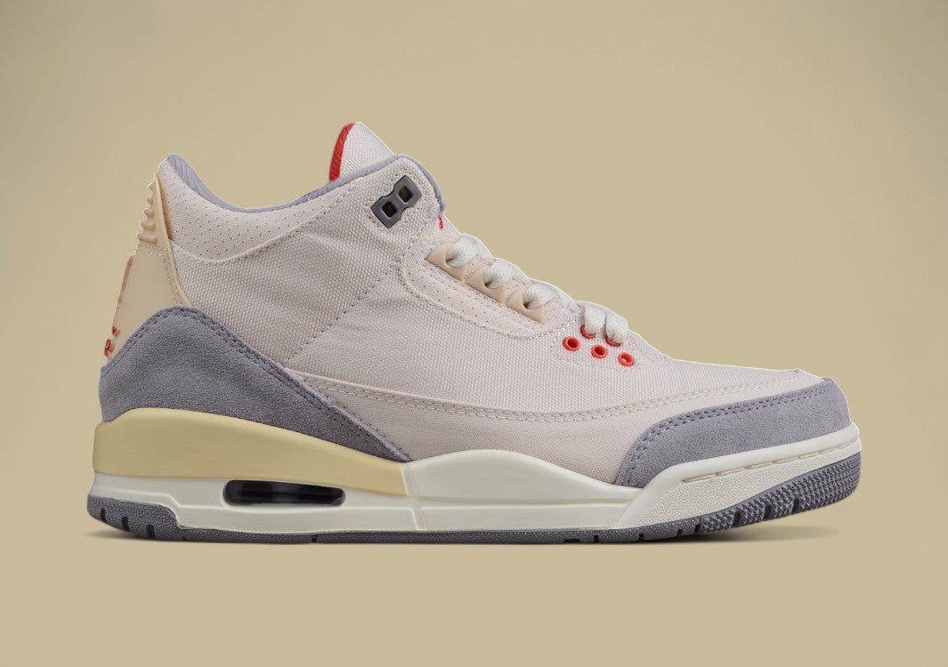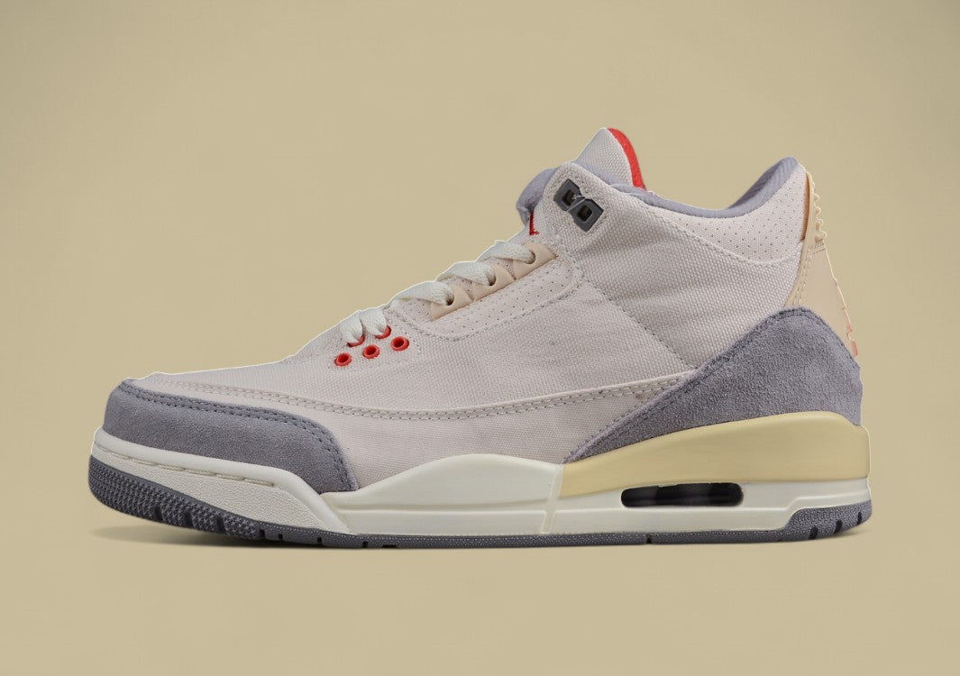 Canvas-Obermaterial in Muslin-Beige mit grauem Wildleder und roten Akzenten. Ein moderner Twist für den AJ3 – natürlich, urban und einzigartig.