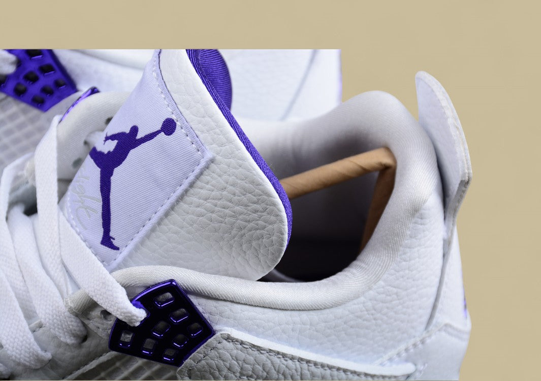 Der Air Jordan 4 Retro "Court Purple" ist ein eleganter Sneaker, der durch seine schlichte Farbgebung und hochwertige Verarbeitung besticht. Das Obermaterial besteht aus hochwertigem weißen Leder, das durch metallisch violette Akzente an den Ösen, dem Jumpman-Logo auf der Zunge und der Ferse sowie der sichtbaren Air-Dämpfung im Fersenbereich ergänzt wird . Die charakteristischen Netz-Einsätze an den Seitenteilen und der Zunge sorgen für Atmungsaktivität, während die weiße Mittelsohle und die violette Außensohle den Look harmonisch abrunden. Insgesamt bietet dieser Sneaker eine gelungene Kombination aus klassischem Design und modernen Details.