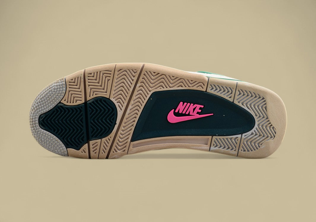 Der Air Jordan 4 Retro SE „Craft – Olive“ präsentiert sich mit einem Obermaterial aus Nubukleder in einem tiefen „Medium Olive“-Ton, ergänzt durch grünes Wildleder an den Seiten und der Zehenkappe. Die charakteristischen „Grid“-Prägungen auf den Wildleder-Paneelen ersetzen das traditionelle Netzmaterial und verleihen dem Schuh einen modernen Touch. Dunkle „Khaki“-Akzente zieren die TPU-Flügel, die Ösen und die Fersenkappe, während ein „Pale Vanilla“-Jumpman-Logo auf der Zunge und der Ferse das Design abrundet.