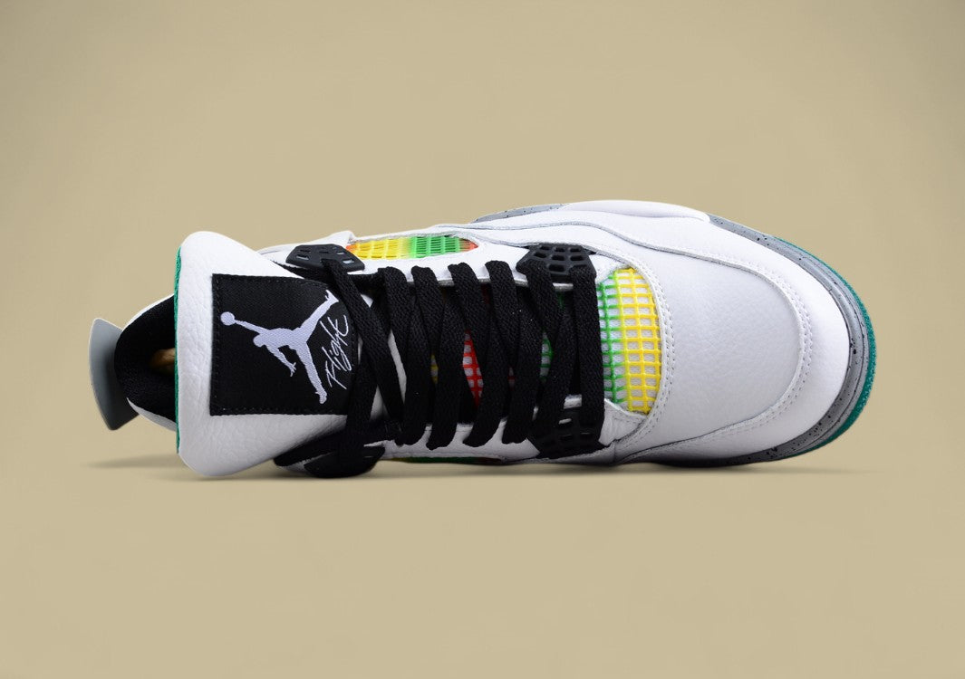 Der Air Jordan 4 Retro "Do The Right Thing" ist eine Hommage an die Hip-Hop- und Streetkultur, inspiriert durch den ikonischen Film von Spike Lee. Das Obermaterial besteht aus hochwertigem weißen Leder, das mit lebendigen Akzenten in Rot, Grün und Gelb auffällig kombiniert wird – Farben, die kulturelle Bedeutung symbolisieren. Schwarze Kontraste an den Flügelösen, der Mittelsohle und dem Fersenclip betonen das strukturierte Design des Schuhs. Klassische Jordan-Elemente wie das Netzgewebe an den Seitenteilen, das sichtbare Air-Element in der Sohle und die Jumpman-Logos bleiben vollständig erhalten. Der Sneaker ist nicht nur optisch ausdrucksstark, sondern bietet durch die robuste Konstruktion und bewährte Dämpfung hohen Tragekomfort.