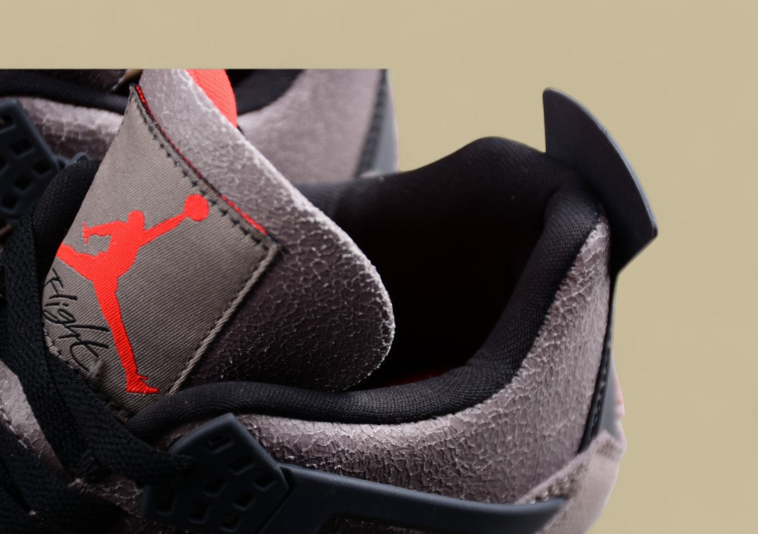 Der Air Jordan 4 Retro "Taupe Haze" präsentiert sich als stilvolle Neuinterpretation des klassischen Jordan 4 Designs. Das Obermaterial besteht aus einer Kombination von strukturiertem Wildleder und rissigem Leder in einem erdigen Taupe-Ton, der dem Schuh eine einzigartige, abgenutzte Optik verleiht. Schwarze Akzente an den Flügelösen, dem Innenfutter und der Fersenlasche setzen kontrastreiche Highlights. Ein leuchtend rotes Jumpman-Logo auf der Zunge sowie rote Details auf der Innenseite der Zunge und der Einlegesohle sorgen für auffällige Farbakzente. Die zweifarbige Mittelsohle mit sichtbarer Air-Dämpfung im Fersenbereich und eingekapselter Air-Einheit im Vorfußbereich bietet optimalen Komfort. Die Kombination aus hochwertigen Materialien und durchdachtem Design macht diesen Sneaker zu einem Must-Have für Sneaker-Liebhaber.