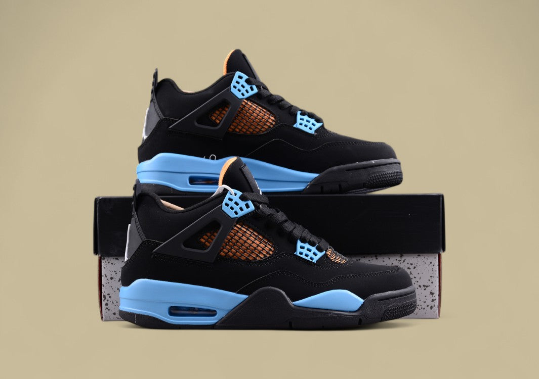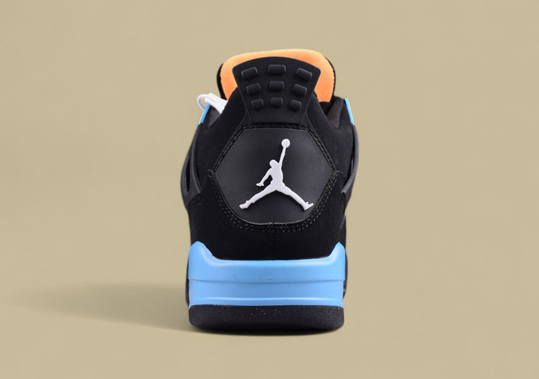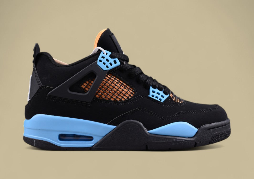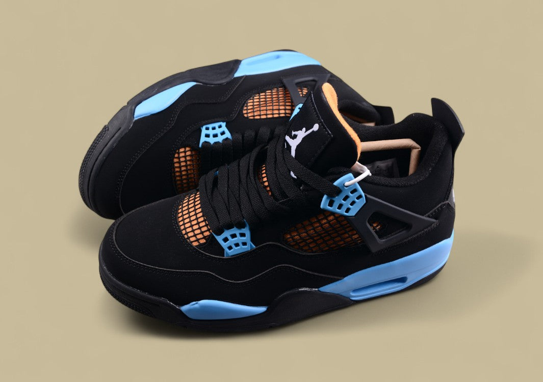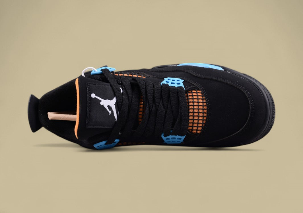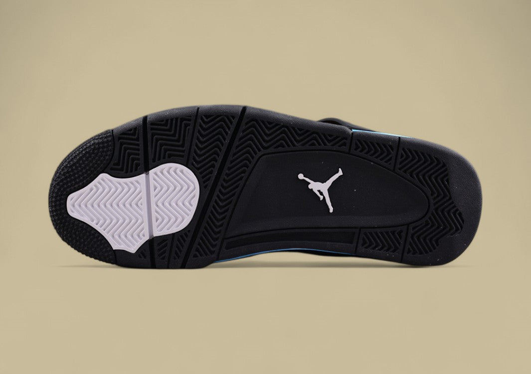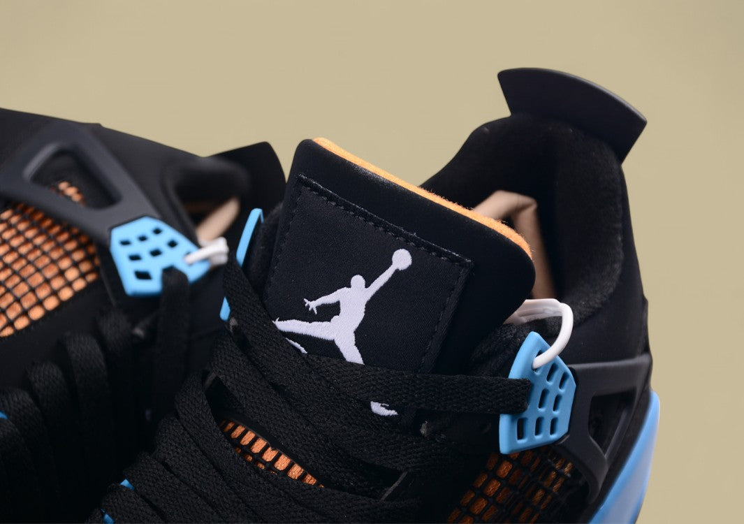 Das Obermaterial des „Thunder“ besteht aus schwarzem Nubukleder, das durch Tour Yellow-Akzente an den Ösen, dem Mittelfußbereich und der Zunge ergänzt wird. Diese leuchtend gelben Details verleihen dem Schuh einen markanten und auffälligen Look. Die charakteristischen Mesh-Einsätze an den Seiten und die TPU-Flügel sorgen für die typische AJ4-Ästhetik. Ein auffälliges Jumpman-Logo ziert die Zunge und die Ferse, während die sichtbare Air-Dämpfungseinheit in der Ferse für Komfort sorgt.