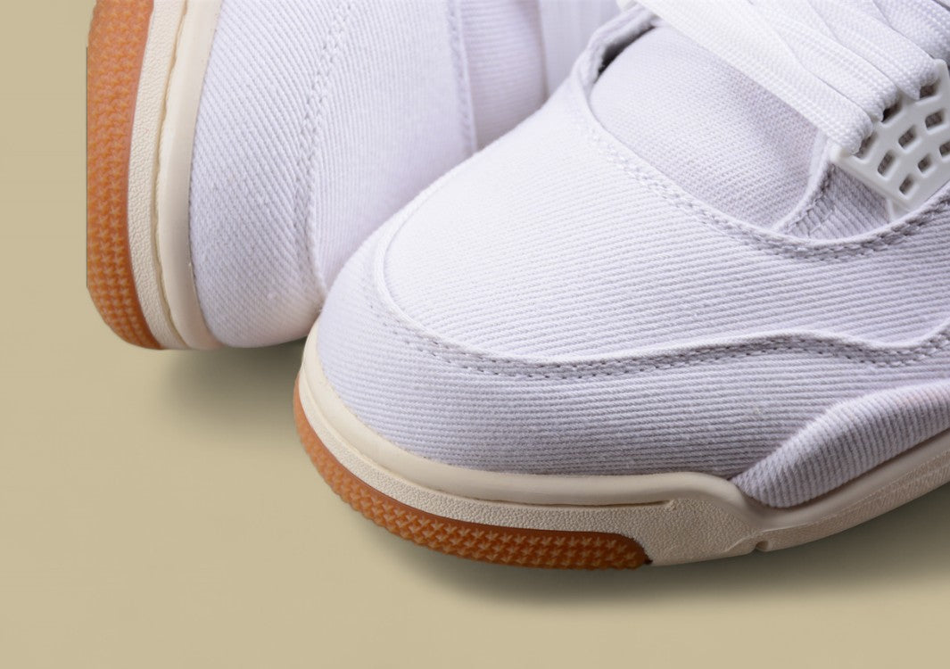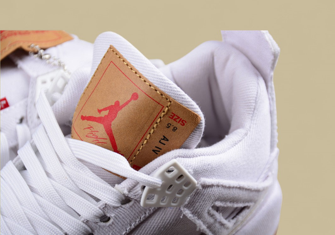 Der Levi’s x Air Jordan 4 “White Denim” bringt frischen Wind in die ikonische Jordan-Reihe – eine stilvolle Kollaboration, bei der minimalistisches Design auf handwerkliche Qualität trifft. Das gesamte Obermaterial besteht aus robustem weißem Levi’s-Denim, was dem Schuh eine außergewöhnliche Textur und einen edlen Look verleiht. Typische AJ4-Elemente wie die Kunststoff-Wings, die sichtbare Air-Dämpfung in der Sohle und die strukturierte Zunge bleiben erhalten, jedoch mit einem neuen, cleanen Twist. Besonders auffällig ist die kontrastierende Gummi-Außensohle, die dem dezenten Weißton einen warmen Akzent verleiht. Ein Levi’s-Label auf der Zunge in Lederoptik sowie das rote Tab an der Seite setzen dezente Markenhighlights. Dieses Modell ist die perfekte Wahl für alle, die Sneaker lieben, aber auf Understatement setzen.