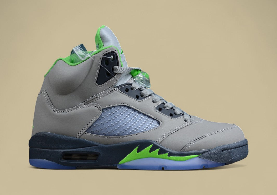 Dunkelgrauer Jordan 5 mit grellen neongrünen Flammen-Akzenten. Starke Kontraste und energiegeladener Streetstyle in einem Modell.