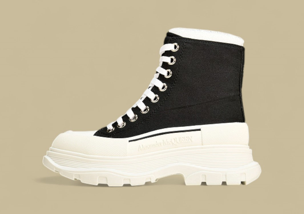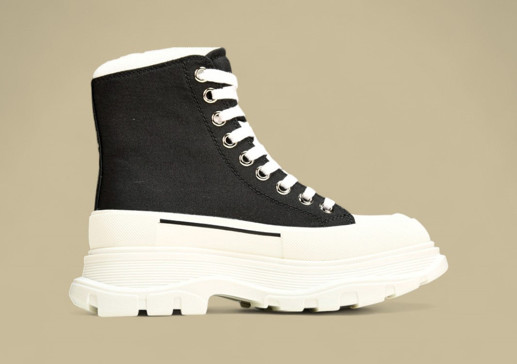 Die Alexander McQueen Thick Sole Heightening Casual Canvas Shoes in Schwarz/Weiß vereinen lässige Canvas-Ästhetik mit markantem High-Fashion-Design. Das schwarze Obermaterial aus robustem Canvas sorgt für einen urbanen, unkomplizierten Look, während die extrahohe weiße Plateausohle einen modernen, optisch streckenden Effekt bietet. Abgerundet wird das Design durch subtile Logo-Details und eine cleane Verarbeitung, die für Alltagstauglichkeit mit modischer Raffinesse steht. Diese Schuhe sind ideal für alle, die sich etwas mehr Höhe wünschen, ohne auf Komfort oder Stil zu verzichten – ein echter Blickfang mit Understatement.