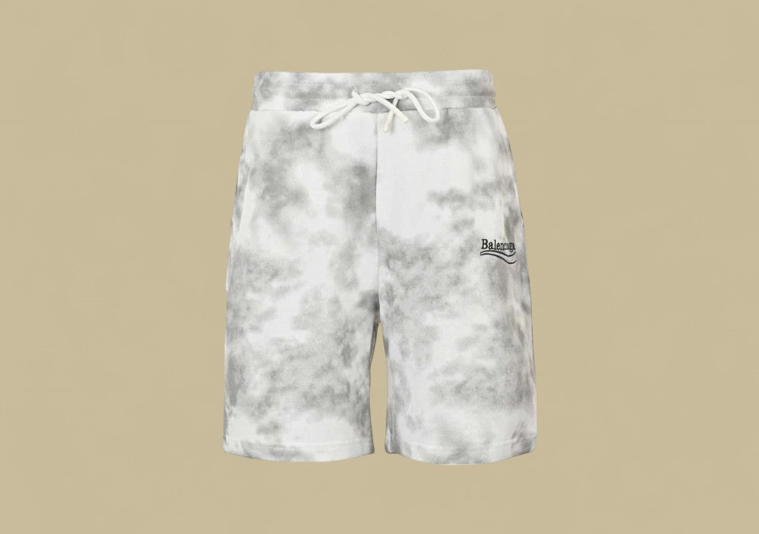Weiße Shorts mit marmoriertem Look und Coca-Cola Logo von Balenciaga.Modischer Style trifft auf urbanen Komfort.