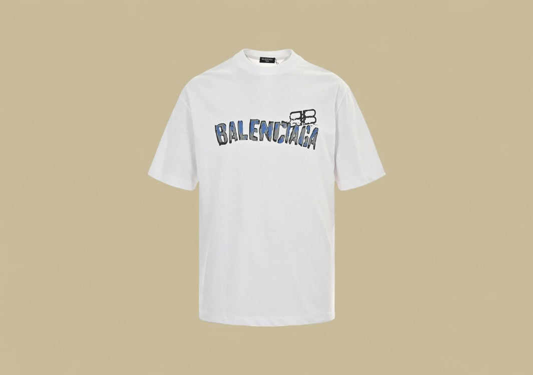 Weißes T-Shirt mit auffälligem Graffiti-Logo von Balenciaga.Kreativer Streetstyle trifft auf lässigen Komfort.