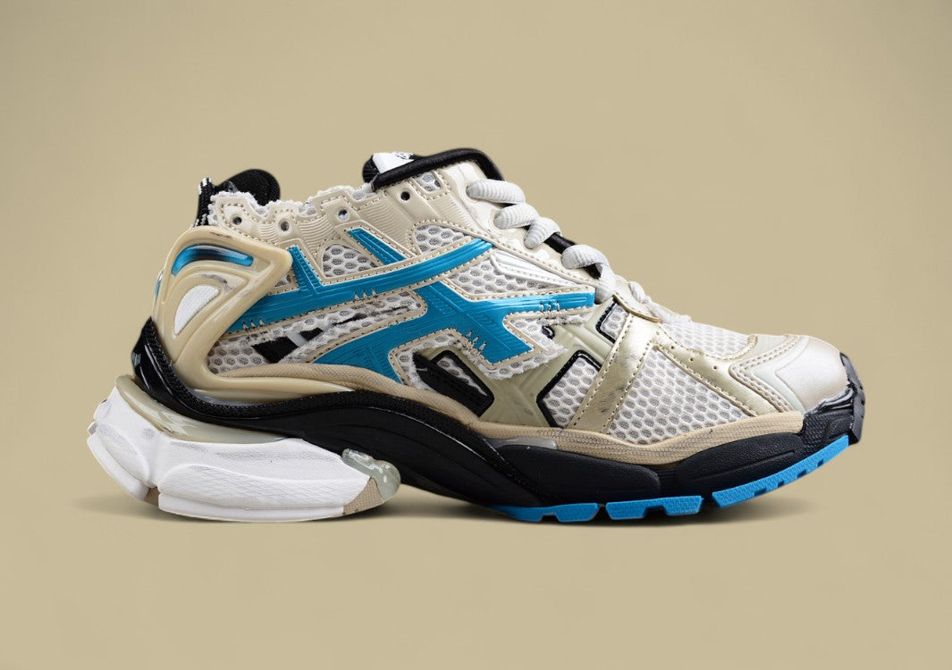 Der Balenciaga Beige and Blue Mesh Runner Sneaker bietet eine perfekte Balance aus Eleganz und Sportlichkeit. Die sanften Farben Beige und Blau verleihen ihm einen modernen, stilvollen Look.