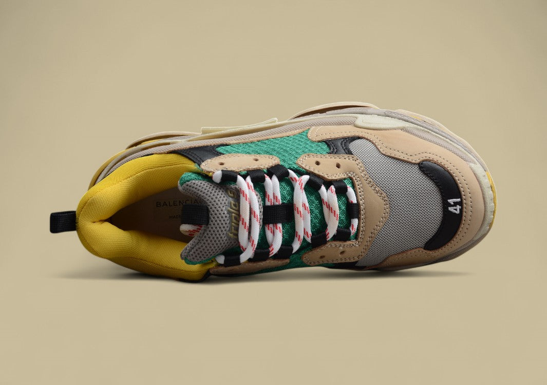 Die Balenciaga Sneakers in Beige und Grün für Damen und Herren vereinen erdige Natürlichkeit mit technischer Eleganz in einem modernen, urbanen Design. Das Obermaterial besteht aus atmungsaktivem Mesh und strapazierfähigen synthetischen Overlays in warmem Beige, ergänzt durch grüne Akzente an der Sohle, Ferse oder den Logos, die dem Schuh frische Lebendigkeit verleihen. Die mehrschichtige, voluminöse Sohle bietet exzellente Dämpfung und eine markante Silhouette im typischen Balenciaga-Stil. Dezente Details und hochwertiges Finishing machen diesen Sneaker zum idealen Begleiter für Alltag, Reisen oder modische Streetwear-Looks. Das Modell ist unisex tragbar und kombiniert Komfort mit einem stilvollen, naturverbundenen Farbspiel.