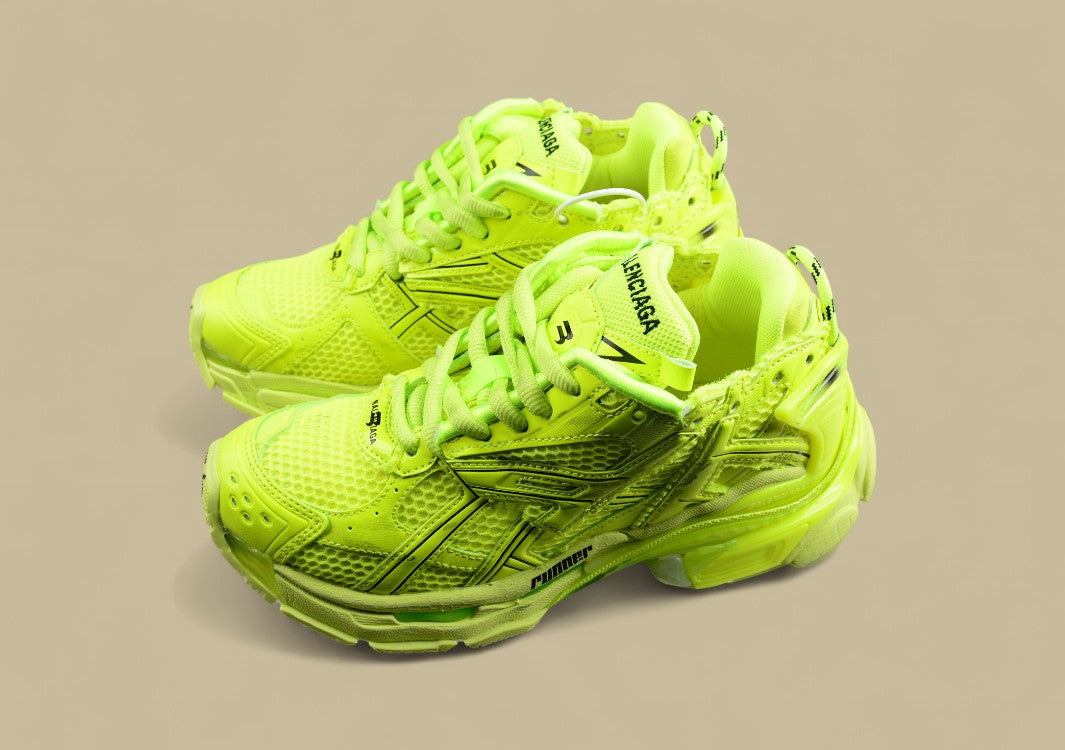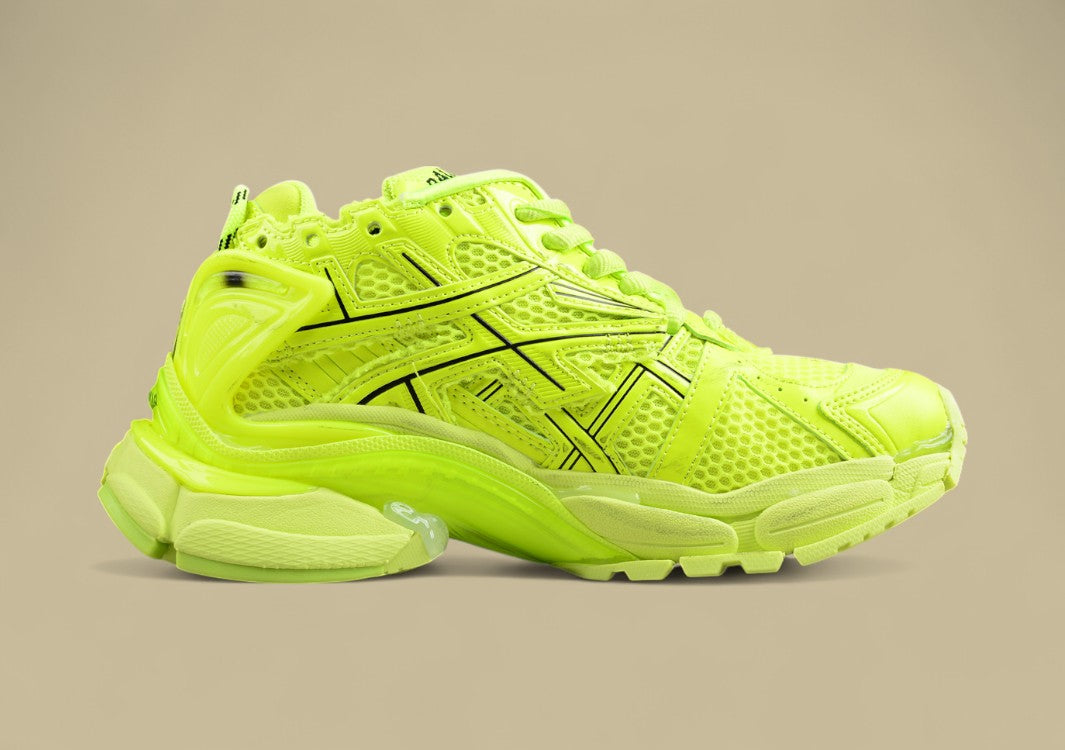 Balenciaga Track Sneaker in Neon-Gelb mit mehrlagiger Struktur und klobiger Sohle.Futuristisches Design trifft auf luxuriösen Streetwear-Flair.