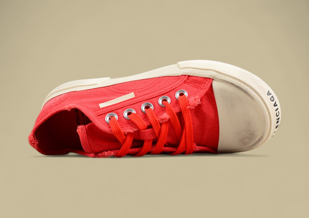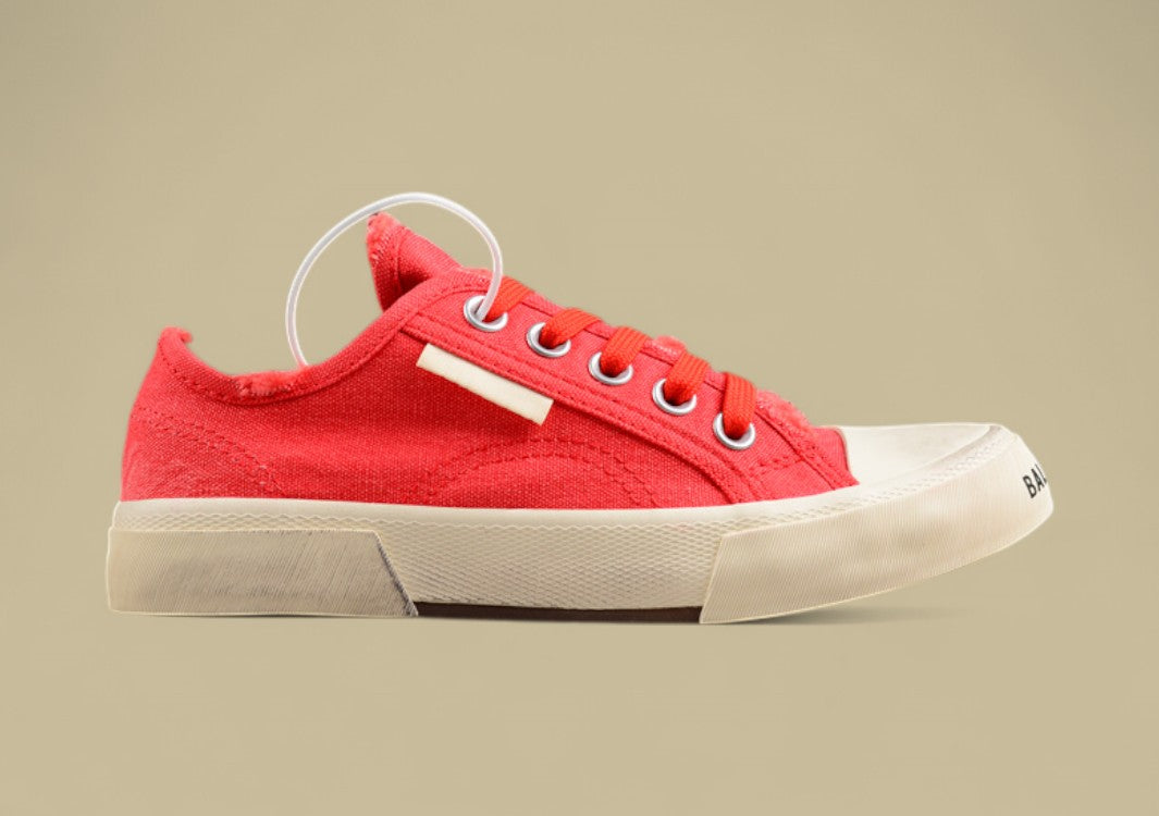 Zerstörter Canvas in kräftigem Rot – roh, laut und modisch ungezähmt.Der Paris Sneaker zeigt Vintage-Attitüde mit rebellischem Luxusflair.