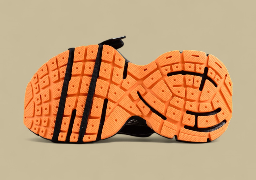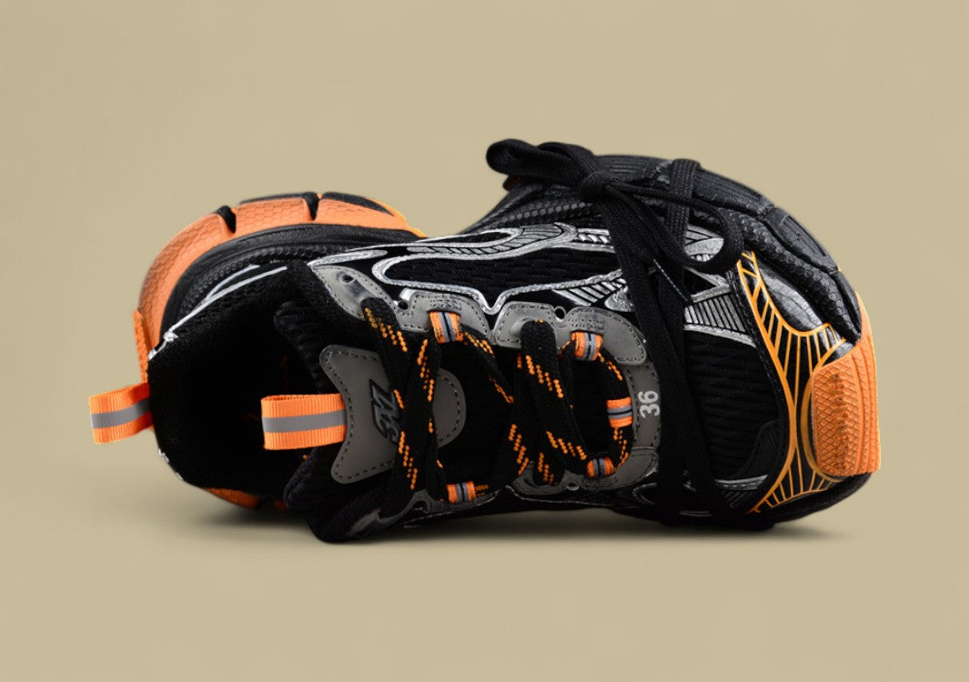Der Balenciaga Runner Sneaker in Schwarz, Silber und Orange kombiniert Retro-Running-Ästhetik mit kraftvollen Farbakzenten und futuristischem Design. Die mehrschichtige Konstruktion aus atmungsaktivem Mesh, glänzenden Silber-Overlays und leuchtend orangefarbenen Highlights sorgt für einen starken visuellen Auftritt. Schwarze Elemente geben dem Schuh Tiefe und Stabilität, während die dynamische Linienführung und die Used-Effekte die markentypische Dekonstruktion betonen. Die profilierte Sohle bietet zuverlässigen Grip und Komfort – ideal für den urbanen Alltag. Dieser Sneaker ist gemacht für alle, die mit Kontrasten, Technik und Stil ein Statement setzen wollen.