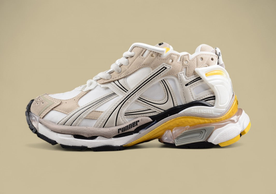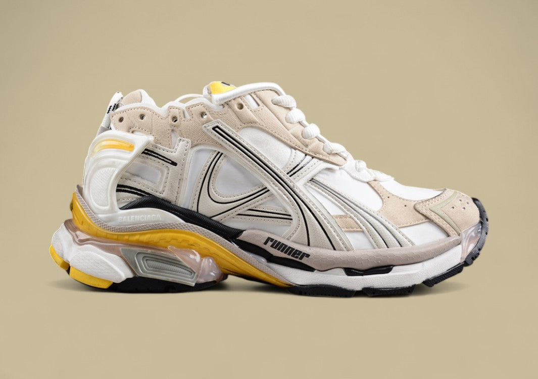 Der Balenciaga Runner Sneaker in Creme, Gelb und Schwarz ist eine kraftvolle Mischung aus Vintage-Laufstil und modernem Design. Die Farbpalette aus weichem Creme, leuchtendem Gelb und tiefem Schwarz verleiht dem Sneaker Tiefe, Kontrast und einen sportlich-dynamischen Charakter. Die charakteristische Runner-Konstruktion mit atmungsaktivem Mesh, technischen Overlays und sichtbaren Nähten erzeugt einen dekonstruierten, bewusst getragenen Look. Die stark profilierte, mehrschichtige Sohle sorgt für Komfort, Halt und markante Präsenz im Straßenbild. Dieser Sneaker ist für all jene, die Retro-Vibes, Performance-Details und modische Ausdruckskraft in einem Schuh suchen.