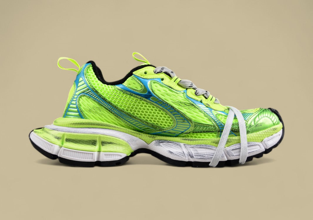 Der Balenciaga Runner Sneaker in Neon-Grün und Blau kombiniert auffällige Farben mit dekonstruiertem Retro-Design. Die mehrlagige Konstruktion aus atmungsaktivem Mesh und synthetischen Overlays sorgt für ein markantes, technisches Erscheinungsbild. Neon-Grün trifft auf kräftiges Blau und erzeugt so einen dynamischen, energiegeladenen Look, der durch die bewusst gealterte Optik noch verstärkt wird. Die voluminöse, ergonomische Sohle bietet optimalen Tragekomfort – ein perfekter Sneaker für alle, die Sportlichkeit, Komfort und mutiges Design vereinen wollen.