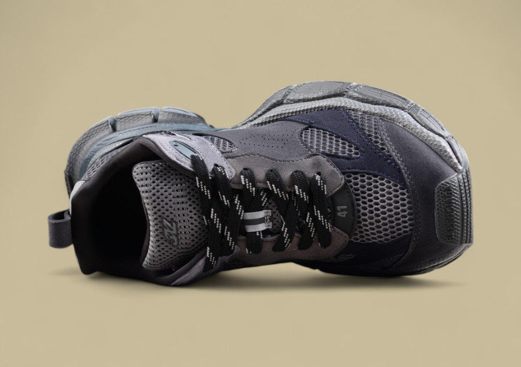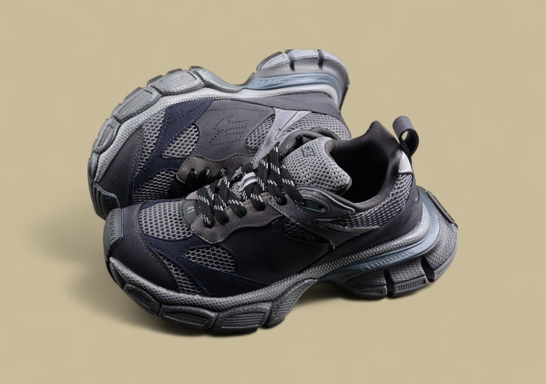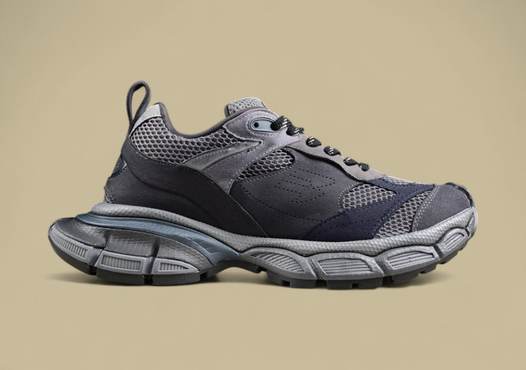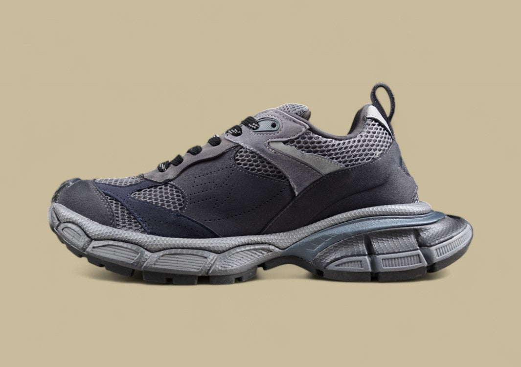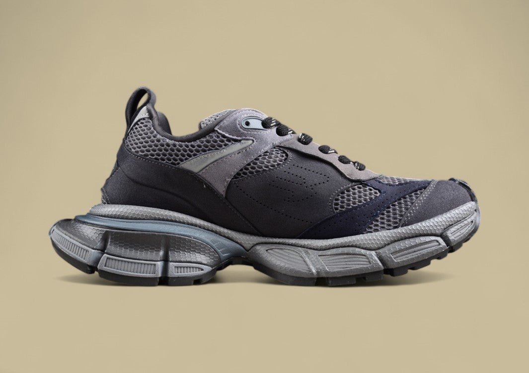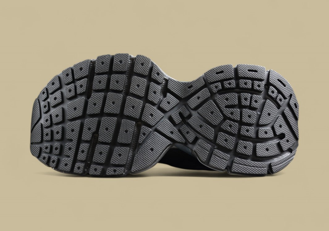 Der Balenciaga Runner Sneaker in Triple Black ist die ultimative Verschmelzung von sportlicher Funktion und düsterer Ästhetik. Komplett in tiefem Schwarz gehalten, entfaltet der Sneaker seine Wirkung durch Struktur, Materialvielfalt und technische Raffinesse. Das mehrlagige Obermaterial aus Mesh und synthetischen Overlays, kombiniert mit sichtbaren Nähten und Used-Effekten, verleiht dem Schuh seinen charakteristischen „getragenen“ Look. Die voluminöse Sohle sorgt für Stabilität und Komfort, während das dekonstruierte Design klassische Laufschuh-Silhouetten neu interpretiert. Dieser Sneaker ist zurückhaltend in der Farbe, aber laut im Ausdruck – perfekt für alle, die Understatement mit High-Fashion verbinden wollen.