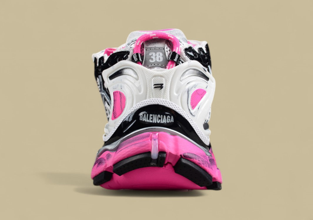 Der Balenciaga Runner Sneaker in Weiß, Schwarz und Pink bringt Retro-Running-Ästhetik mit frischen Farbakzenten auf die Straße. Die mehrlagige Konstruktion aus atmungsaktivem Mesh und synthetischen Overlays sorgt für Tiefe, Textur und den markentypischen dekonstruierten Look. Weiß dominiert die Basis und verleiht Leichtigkeit, während schwarze Details für Struktur und Definition sorgen. Kräftige Pink-Highlights setzen gezielte, modische Akzente und verleihen dem Sneaker eine feminine, sportliche Energie. Die profilierte Sohle garantiert Komfort und Halt, während sichtbare Nähte und Used-Effekte das Design abrunden. Ein Statement-Sneaker für alle, die mutige Farben mit technischem Stil verbinden wollen.