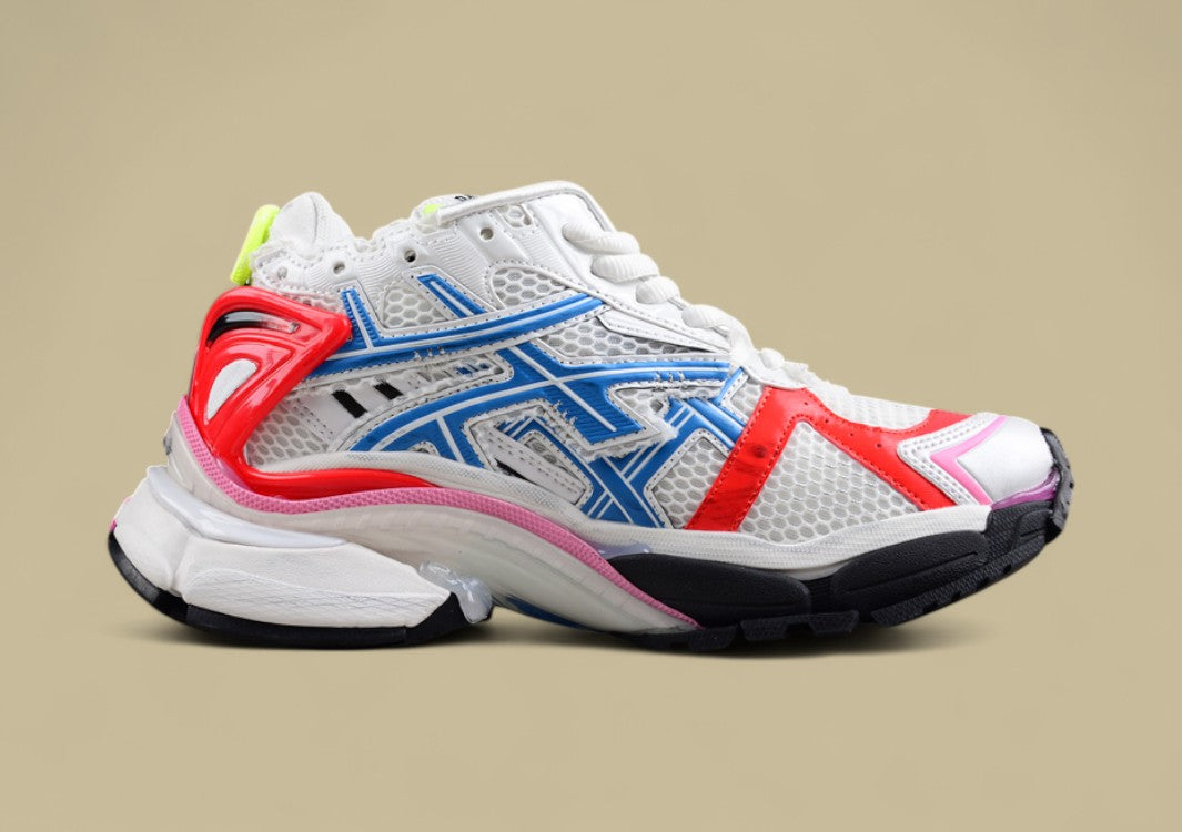 Balenciaga Runner Sneaker in Weiß, Blau und Rot mit Vintage-Finish.Sportlicher Colorway trifft auf dekonstruierten High-Fashion-Look.