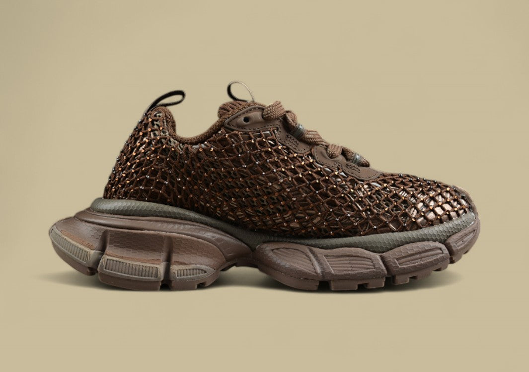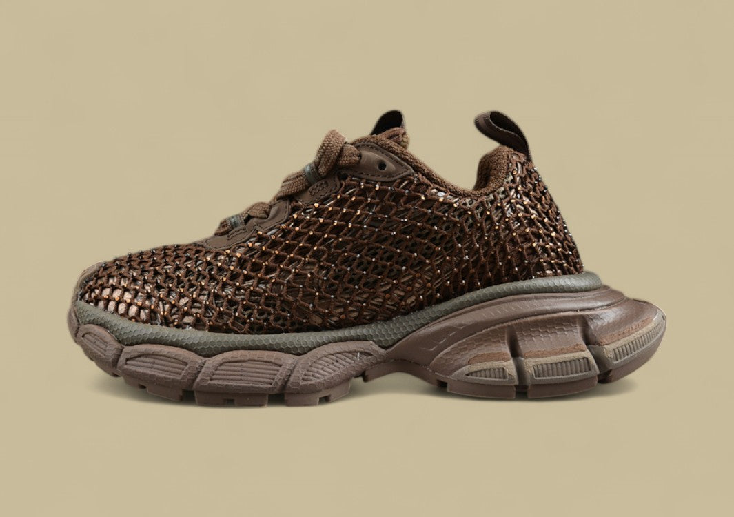 Moderner Balenciaga Runner Sneaker mit Metallic Brown Mesh.Atmungsaktives Obermaterial kombiniert mit futuristischem Design.Klobige Sohle für Komfort, Stil und Stabilität.