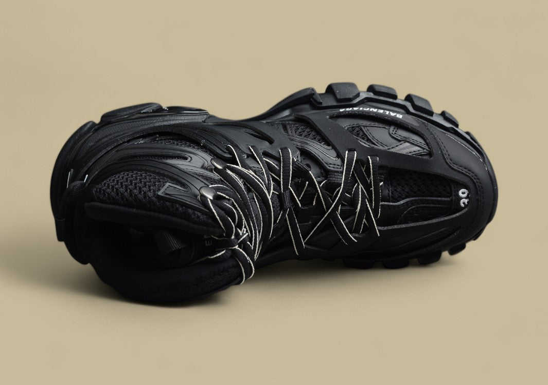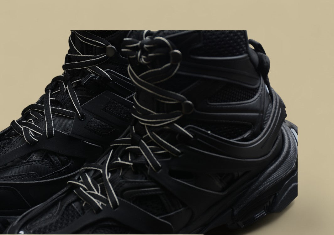 Der Balenciaga Track High Top 3.0 in Schwarz kombiniert eine komplexe, mehrlagige Konstruktion aus atmungsaktivem Mesh und strapazierfähigem Nylon, die für optimalen Komfort und Langlebigkeit sorgt. Die klobige, dynamisch geformte Sohle bietet nicht nur hervorragende Dämpfung, sondern verleiht dem Sneaker auch eine unverwechselbare Silhouette. Mit Details wie dem eingeprägten "Track"-Schriftzug an der Ferse, dem "BB"-Logo auf der Außensohle und dem gedruckten Balenciaga-Logo auf der Seite hebt sich dieses Modell deutlich von der Masse ab. Die High-Top-Silhouette bietet zusätzlichen Halt und unterstreicht den modernen, technischen Look. Ein Must-have für alle, die einen auffälligen und dennoch vielseitigen Sneaker suchen.