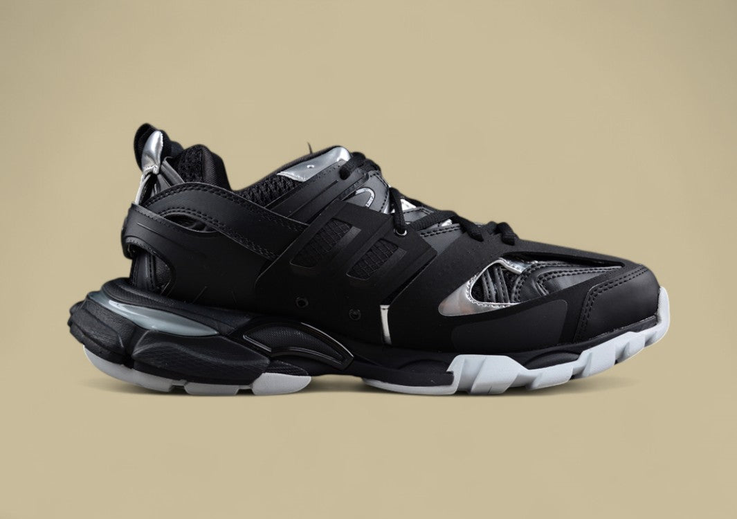 Schwarz trifft auf Silber – der Track Sneaker wirkt kraftvoll, technisch und futuristisch.Ein High-Fashion-Runner für starke Streetwear-Looks mit metallischem Akzent.