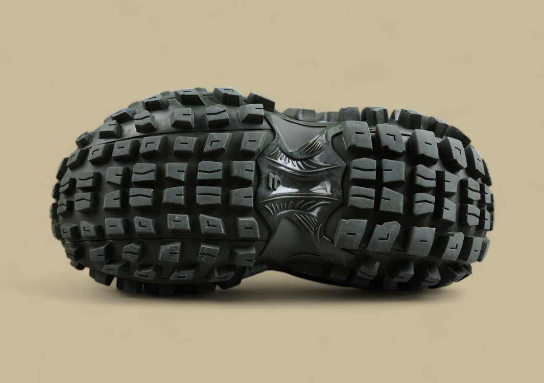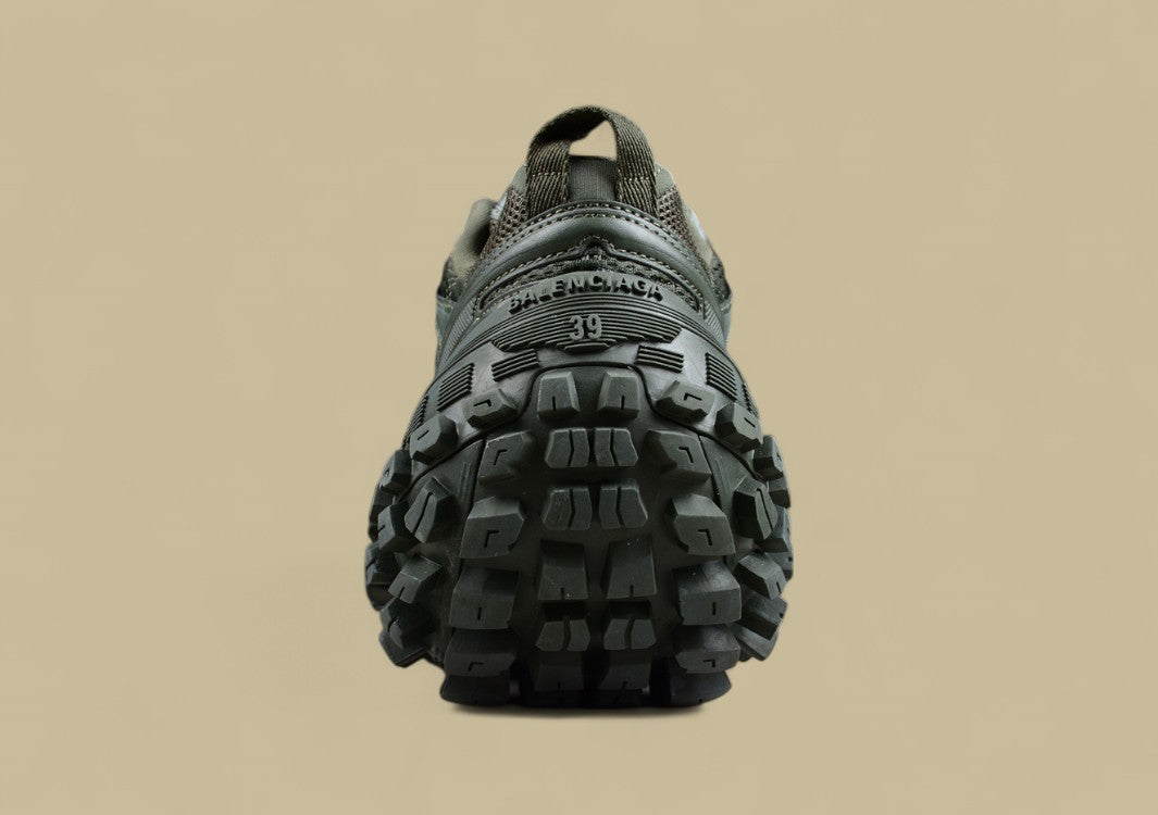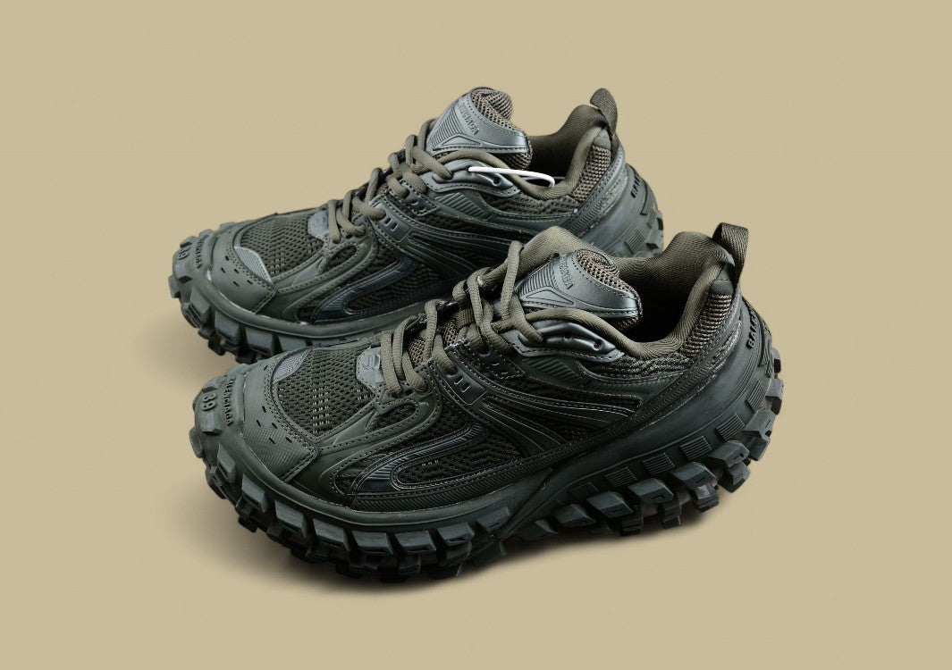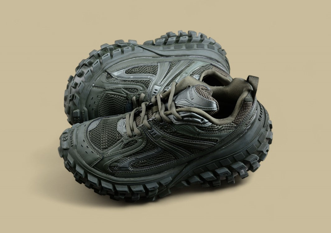 Der Balenciaga Track Sneaker in Olive Green kombiniert militärisch inspirierte Farbnuancen mit einem futuristischen, mehrlagigen Design. Die grüne Farbgebung verleiht dem Sneaker eine robuste, erdige Ausstrahlung, während die komplexe Konstruktion aus Mesh und synthetischen Materialien eine markante Silhouette und überragenden Komfort bietet. Die klobige Profilsohle sorgt für Stabilität und eine starke Präsenz, die den Sneaker sowohl im urbanen als auch im Outdoor-Bereich hervorhebt. Ein stylischer, vielseitiger Sneaker, der Funktionalität und Mode vereint.