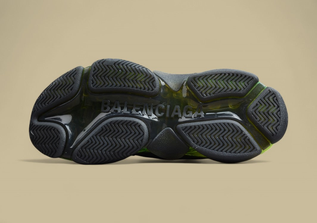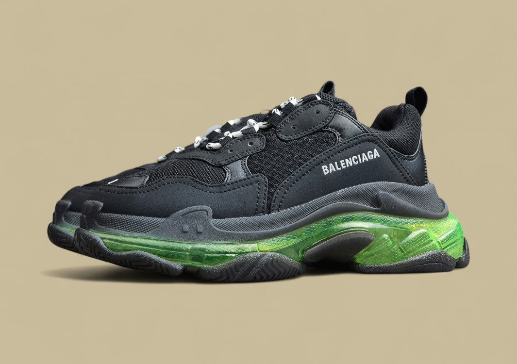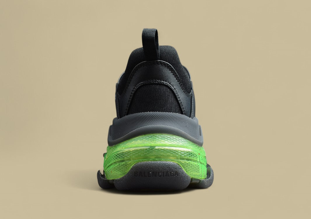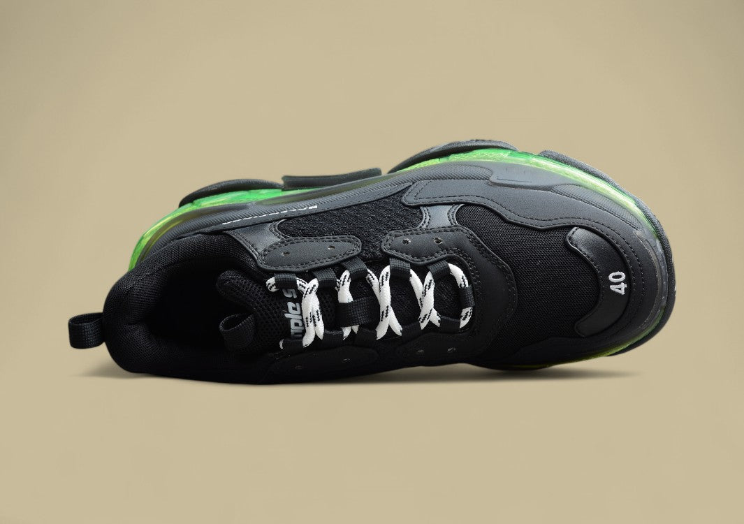 Der Balenciaga Triple S Black Green kombiniert schwarzes Upper mit greller, grüner Sohle – modern, gewagt und maximal auffällig.
