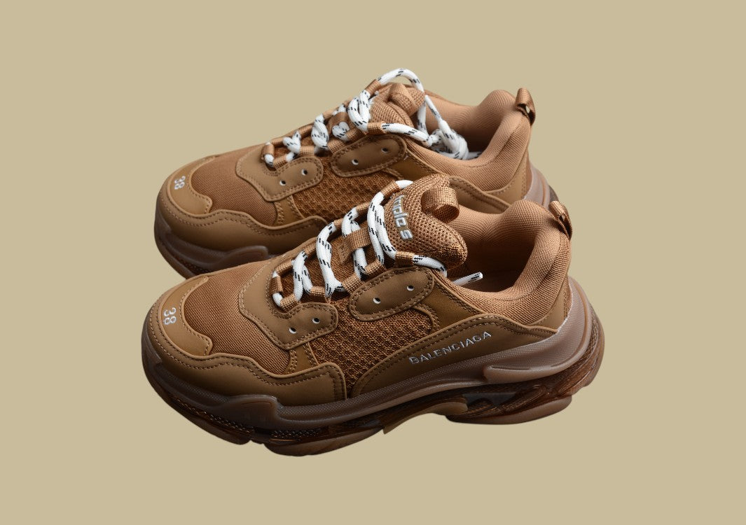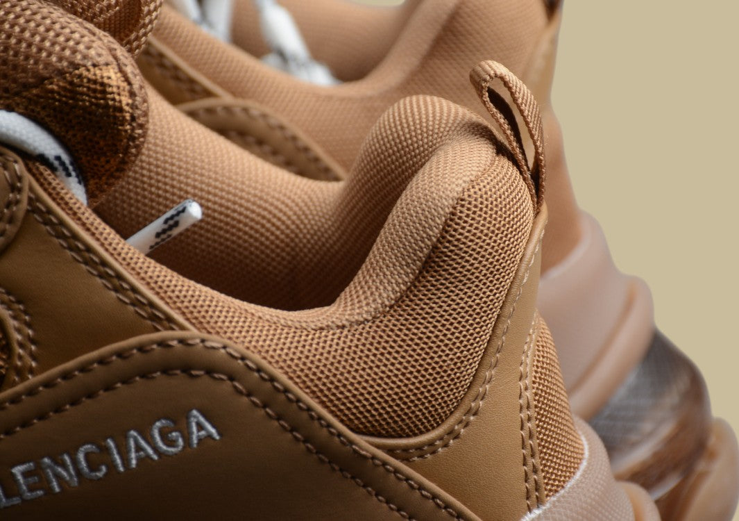Der Balenciaga Triple S Khaki überzeugt mit markanter Sohle, khakifarbener Eleganz und ikonischem Streetwear-Charakter.