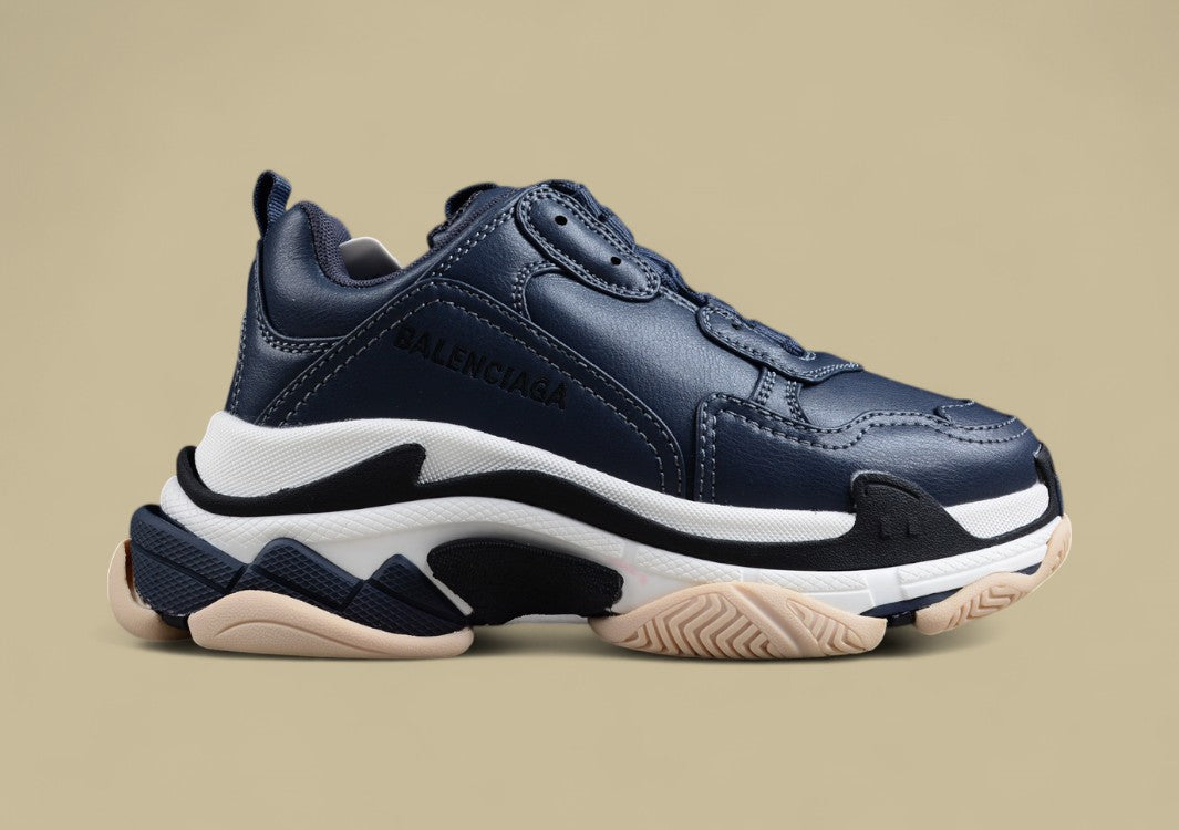 Balenciaga Triple S Sneaker in Navy mit markanter, mehrlagiger Sohle.Luxuriöser Streetstyle in einem eleganten Blauton.