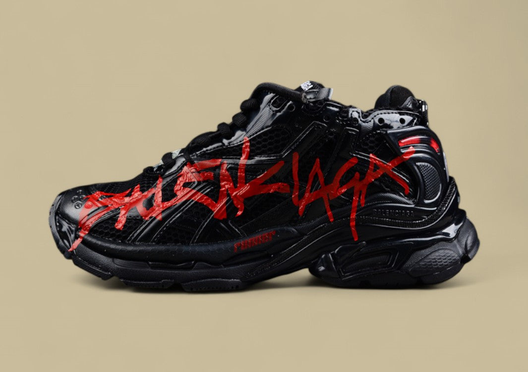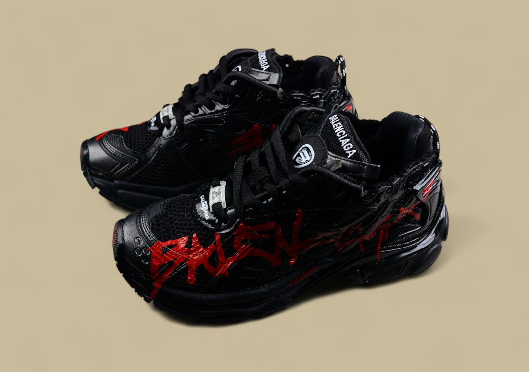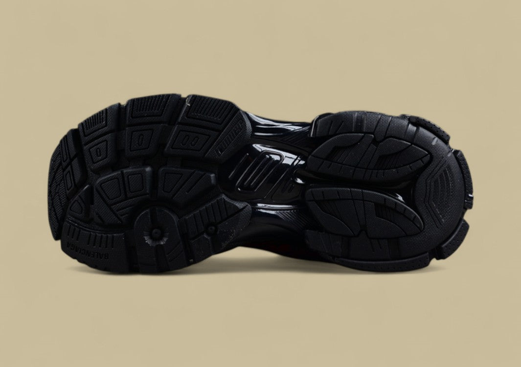 Der Balenciaga x Future Sneaker in Schwarz mit Rot vereint futuristisches Design und sportliche Raffinesse. Die auffällige Kombination aus schwarzem Mesh und synthetischen Materialien wird durch lebendige rote Akzente auf der Sohle und an den Details hervorgehoben, was dem Sneaker eine dynamische Ausstrahlung verleiht. Mit seiner innovativen, mehrlagigen Struktur und der robusten, stabilen Sohle bietet der Sneaker nicht nur visuelle Wirkung, sondern auch unvergleichlichen Komfort. Ein perfektes Modell für diejenigen, die technisches Design mit einer mutigen Farbwahl verbinden möchten.