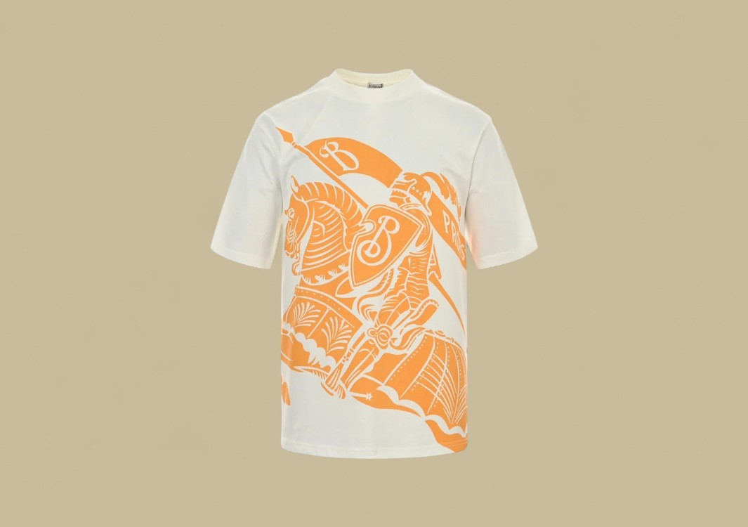 Das Burberry 24SS Knight Warhorse Logo Graphic T-Shirt in Weiß & Orange bringt frischen Wind in die klassische Streetwear-Silhouette. Gefertigt aus hochwertiger, weicher Baumwolle bietet es ein angenehmes Tragegefühl und eine moderne, lockere Passform. Der auffällige Warhorse-Print in leuchtendem Orange setzt auf dem weißen Untergrund ein kraftvolles visuelles Statement und interpretiert das ikonische Burberry-Rittermotiv auf zeitgemäße Weise. Dieses T-Shirt vereint markante Grafik mit klarer Linie – perfekt für Looks, die Selbstbewusstsein und Stil ausstrahlen.