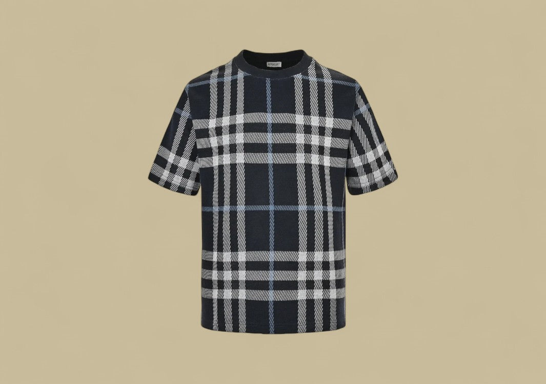 Das Burberry 24SS Plaid Knit T-Shirt in Navy Check bringt das charakteristische Karomuster der Marke in eine moderne, gestrickte Form. Hergestellt aus einem hochwertigen Baumwollstrick vereint dieses T-Shirt edlen Tragekomfort mit markanter Optik. Das klassische Navy-Karomuster verleiht dem Shirt eine stilvolle Tiefe und hebt es deutlich von klassischen Basics ab. Mit seiner regulären Passform und der feinen Verarbeitung ist es ideal für modebewusste Looks, die britische Tradition mit zeitgemäßem Stil verbinden. Ein Statement für Kenner, dezent und doch unverkennbar Burberry.