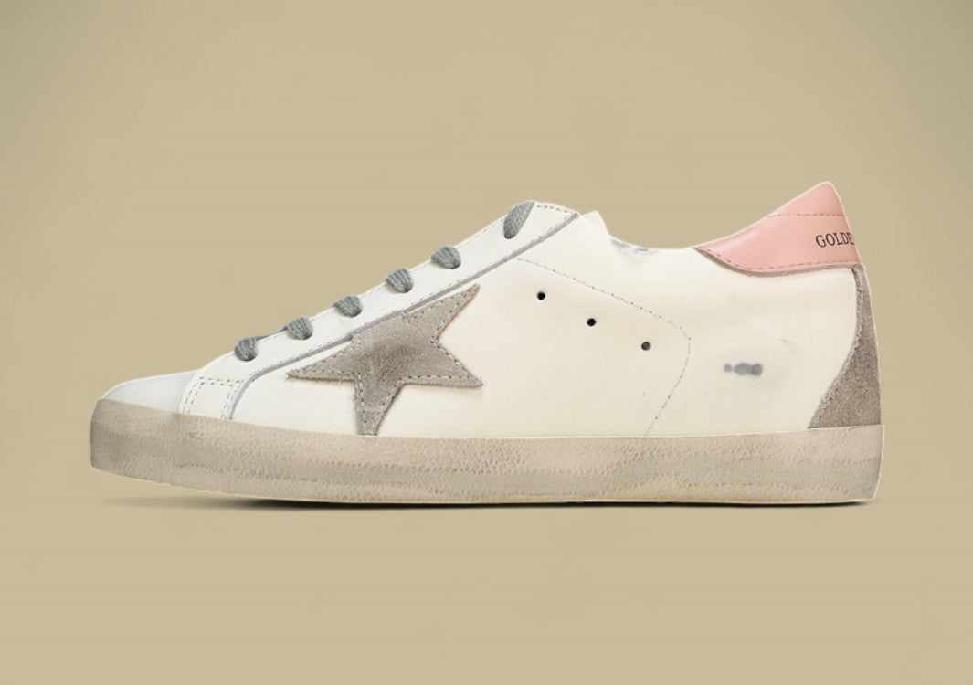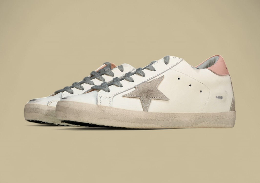 Weiße Vintage-Sneaker mit grauen Details und rosafarbenem Stern.Feminin, bequem und typisch Golden Goose mit Charakter.