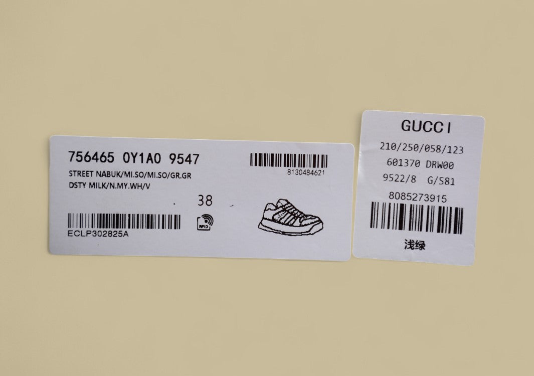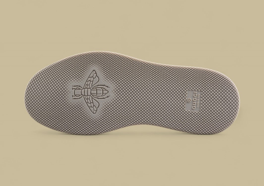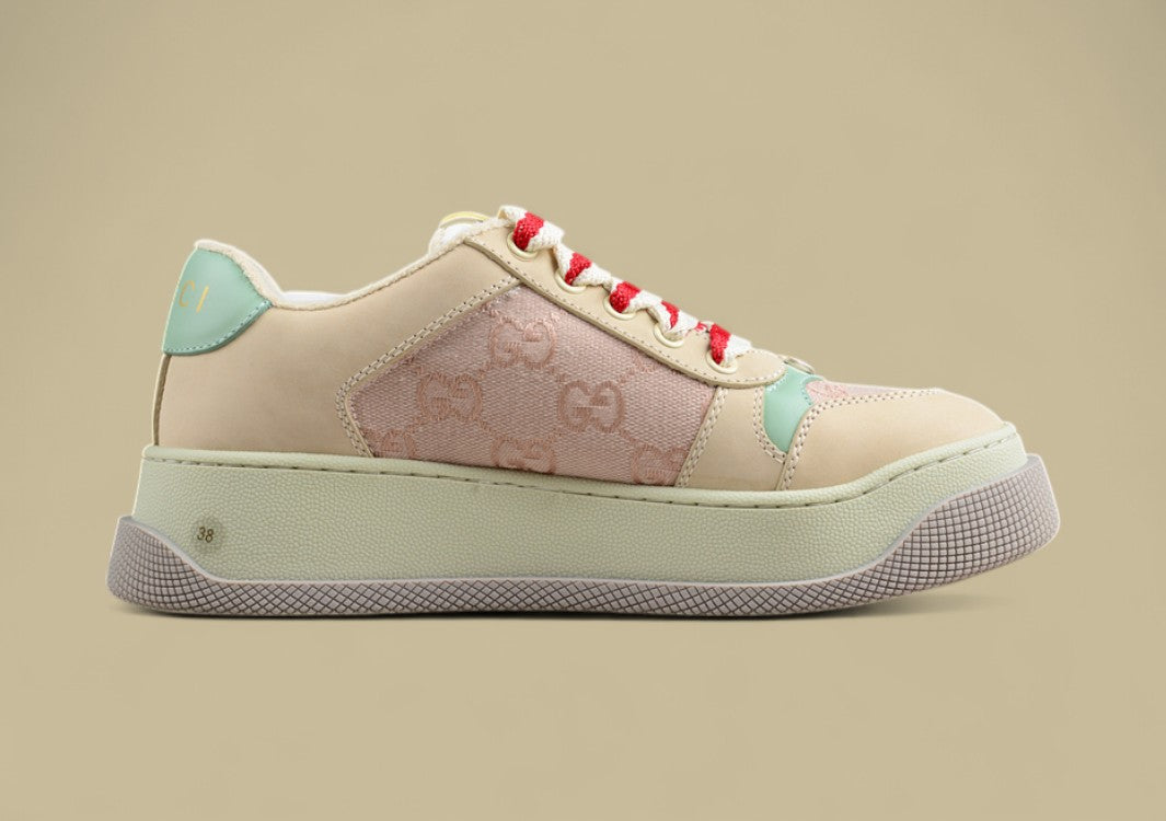 Beigefarbene Gucci Platform-Sneaker mit GG-Monogramm und mint-roten Details. Retro-Chic trifft auf frische Farbnuancen und Plateau-Style.