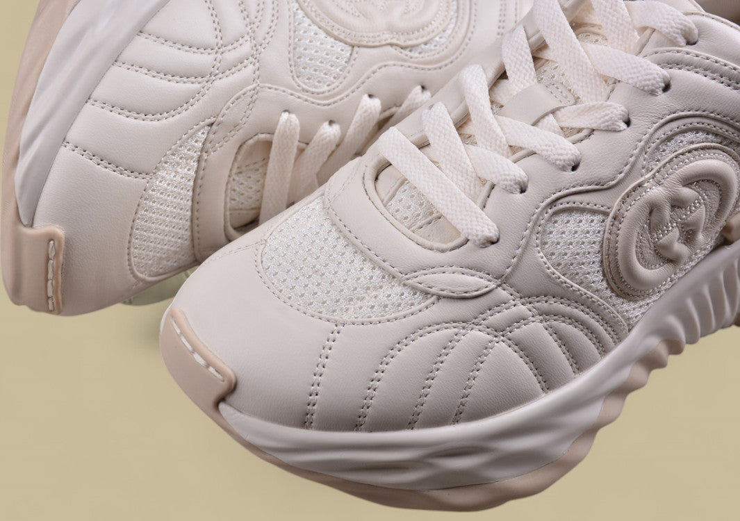 Ivoryfarbene Gucci Run Sneakers mit geprägtem GG und skulpturaler Sohle. Clean, edel und perfekt für modernen Minimalismus.