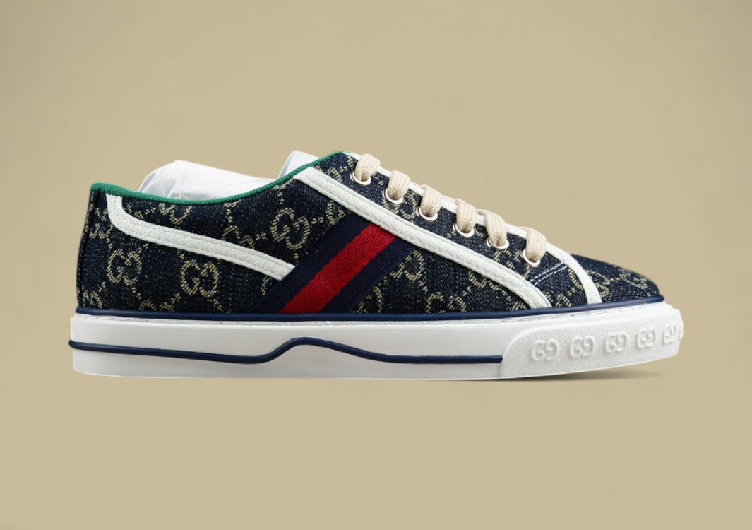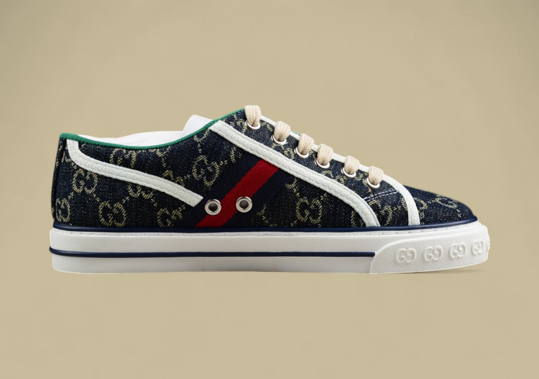 Gucci Tennis Low Sneaker aus navyfarbenem GG-Denim mit Web-Streifen. Lässiger Luxus trifft auf klassischen Markenstil.