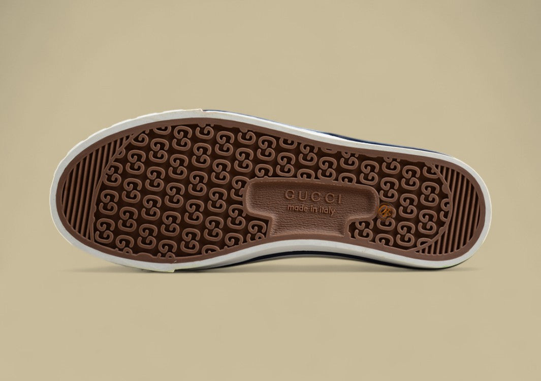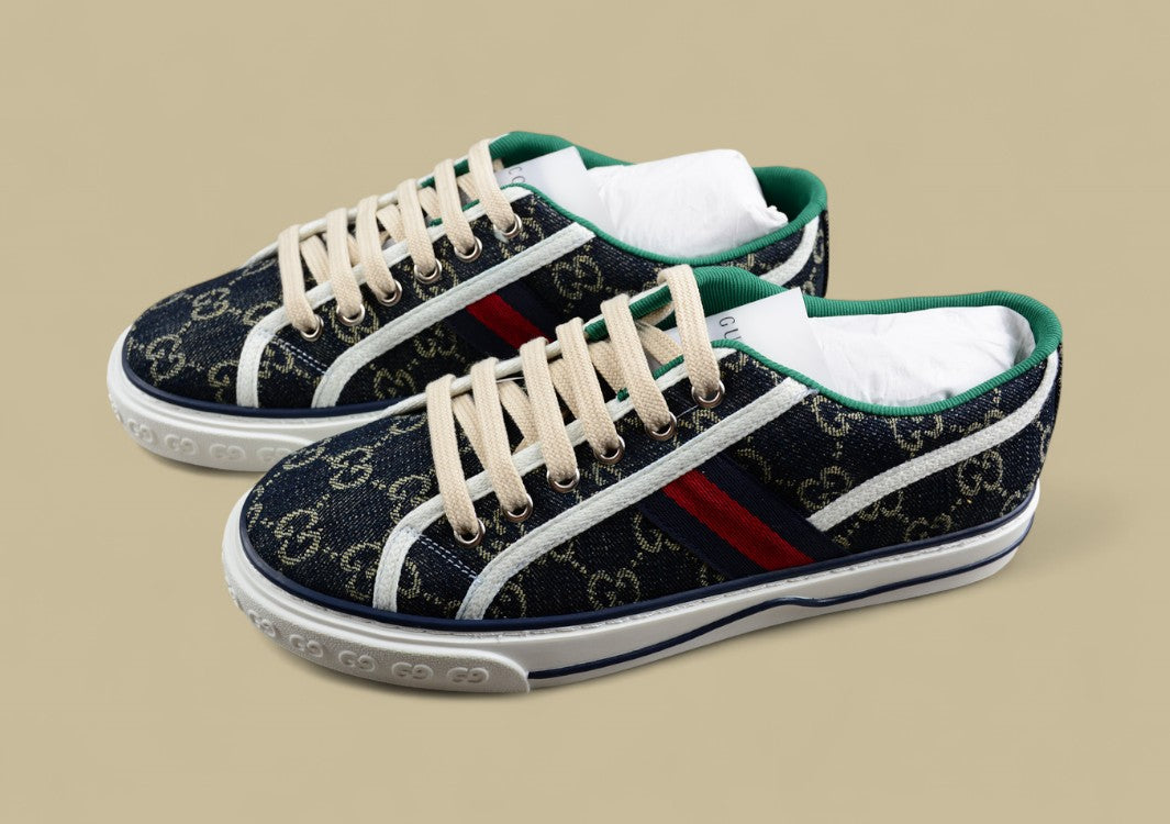 Die Gucci Tennis Low Sneakers in navyfarbenem GG-Monogramm-Denim verbinden klassischen Stil mit lässigem Streetwear-Appeal. Das Obermaterial aus robustem, tiefblauem Denim ist mit dem ikonischen GG-Muster durchzogen und verleiht dem Schuh eine markante Textur und visuelle Tiefe. Der seitliche grün-rote Web-Streifen setzt ein typisches Gucci-Statement, während die klare Low-Top-Silhouette für Alltagstauglichkeit und vielseitige Kombinierbarkeit sorgt. Ein stilvoller Mix aus Retro-Tennislook und modernem Denim-Style.