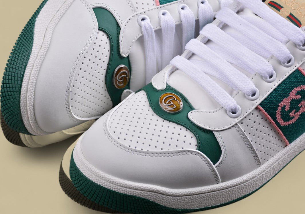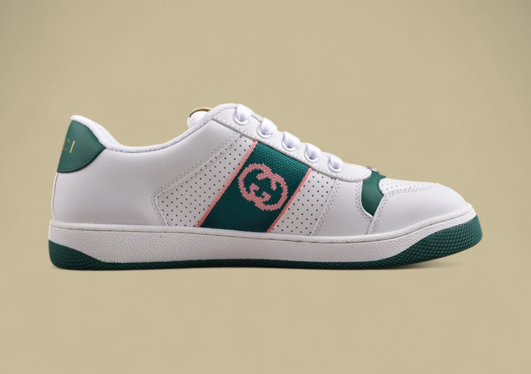 Weiße Gucci Ace Sneakers mit grün-rosa Webstreifen. Ein eleganter Klassiker mit frischer Farbnote.