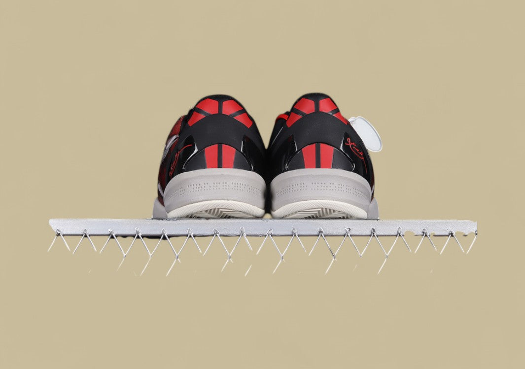 Kobe 8 System „Milk Snake“ in Rot, Creme und Grau mit schuppenartiger Textur.Elegant, aggressiv und komfortabel – für Spieler mit Mamba-Mentalität.