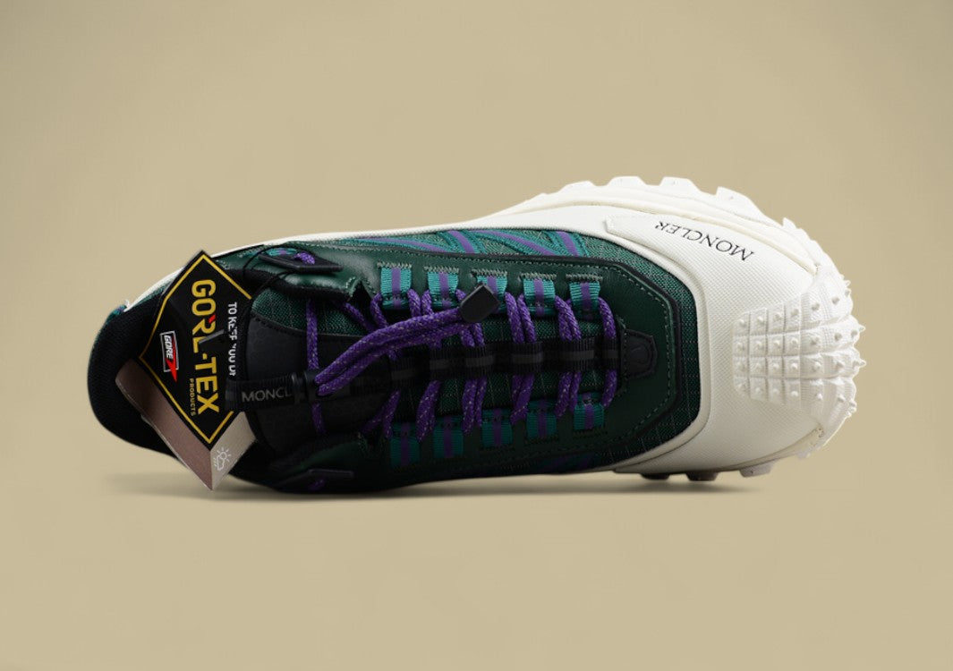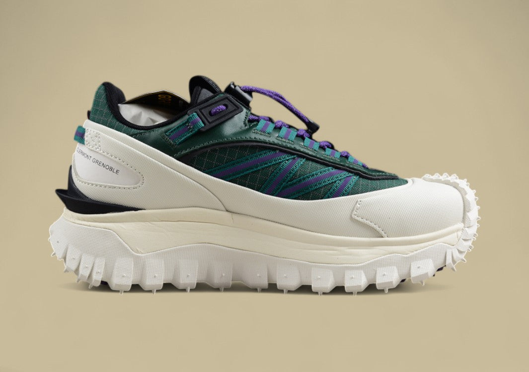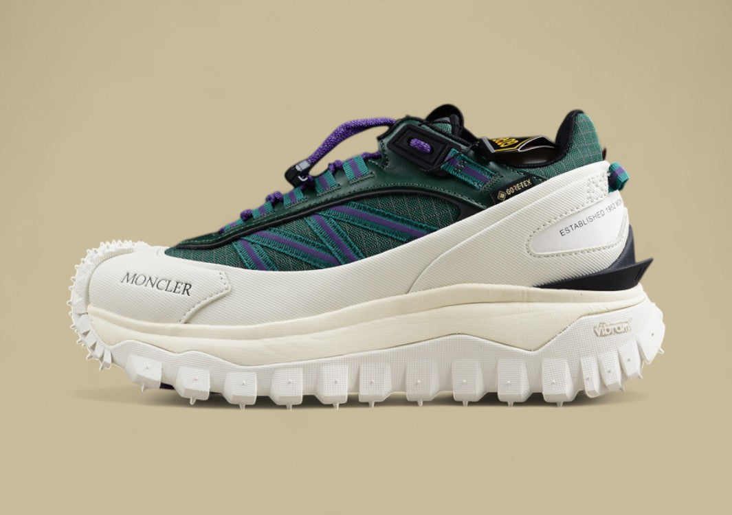 Natur trifft Technik: Der Trailgrip GTX in Pine Green & Off-White kombiniert GORE-TEX®-Wetterschutz mit Vibram®-Grip und klassischer Moncler-Ästhetik.