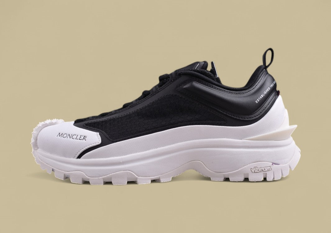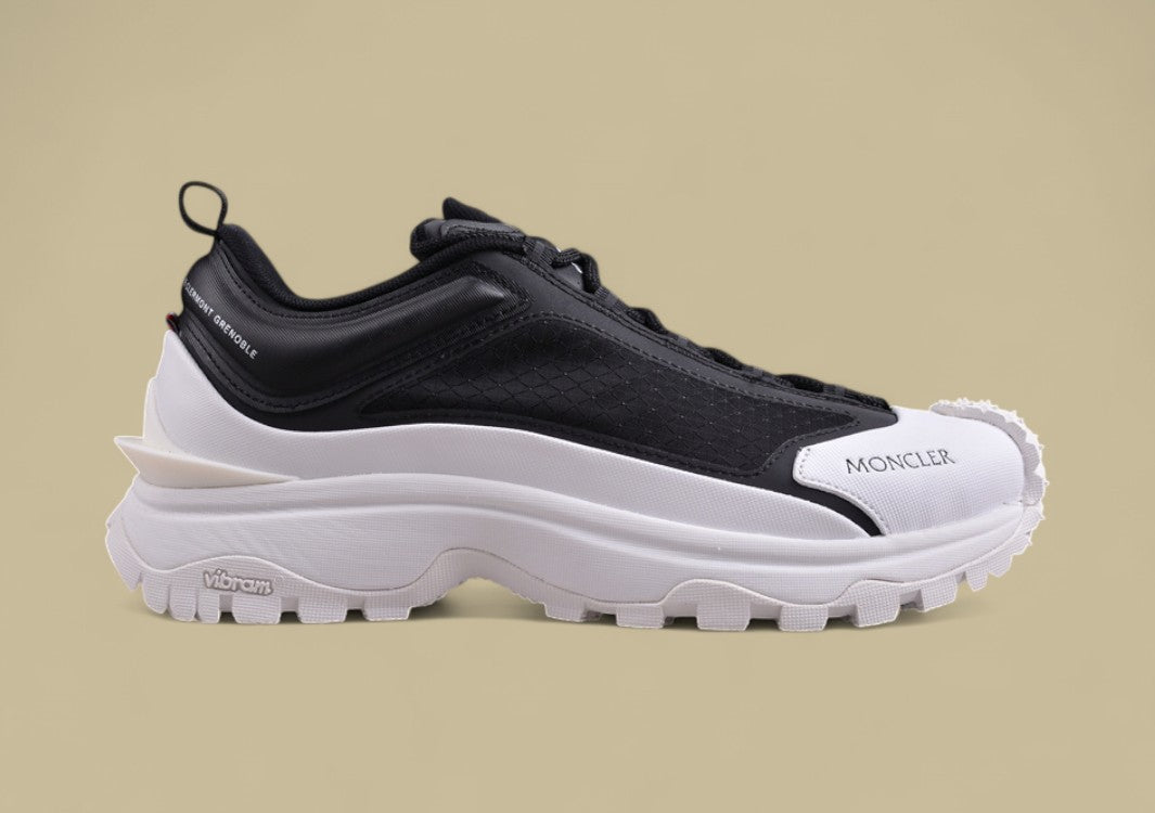 Klassisch & wetterfest: Der Trailgrip GTX in Schwarz-Weiß bietet GORE-TEX®-Schutz, Vibram®-Grip und kompromisslosen Moncler-Komfort.