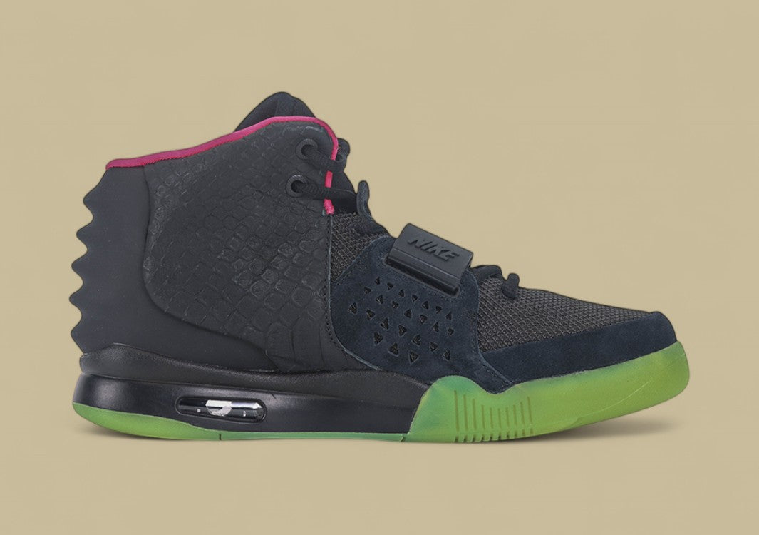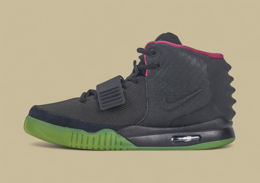 Der Nike Air Yeezy 2 „Solar Red“ ist eine der ikonischsten Sneaker-Kollaborationen zwischen Nike und Kanye West. Ursprünglich am 9. Juni 2012 veröffentlicht, kombiniert dieses Modell High-Fashion-Ästhetik mit sportlicher Funktionalität. Das Obermaterial besteht aus einer Mischung hochwertiger Materialien, darunter Mesh, Leder und ein markantes, an Schlangenhaut erinnerndes Seitenpanel. Ein geformter Gummi-Fersenbereich mit ausgeprägten Rillen verleiht dem Schuh seine einzigartige Silhouette. Die leuchtend rote Innenfütterung sorgt für einen auffälligen Kontrast zum schwarzen Obermaterial. Ein besonderes Highlight ist die glow-in-the-dark Außensohle, die dem Sneaker einen futuristischen Touch verleiht. Zusätzlich ziert ein ägyptisch inspiriertes Symbol die Zunge, was Kanye Wests Interesse an Ägyptologie widerspiegelt. Mit seiner limitierten Auflage und dem einzigartigen Design bleibt der Air Yeezy 2 „Solar Red“ ein begehrtes Sammlerstück in der Sneaker-Welt.