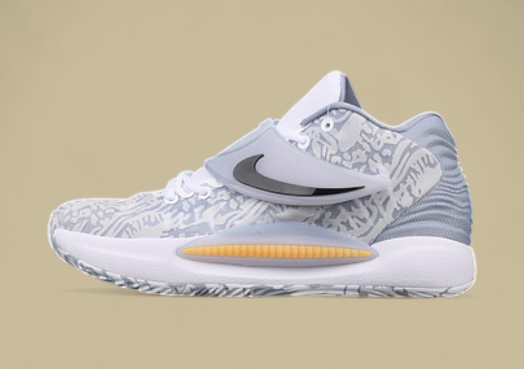 Die Nike KD Basketballschuhe mit grau-weißem Camo-Obermaterial vereinen taktisches Design mit innovativer Technik für maximale Kontrolle auf dem Court. Das camouflagemusterte Upper sorgt für einen modernen, urbanen Look und bietet zugleich Stabilität und Atmungsaktivität. Ein halbtransparenter Strap über dem Mittelfuß sorgt für sicheren Halt und ein futuristisches Design-Element. Der schwarze Swoosh sticht klar hervor und bringt eine kraftvolle visuelle Struktur in das Tarnmuster. Die Zoom Air Dämpfung in der Zwischensohle liefert reaktionsfreudige Unterstützung bei schnellen Richtungswechseln, Sprüngen und intensiven Spielzügen – ein Schuh für Spieler, die Stil, Technik und Leistung perfekt vereinen möchten.