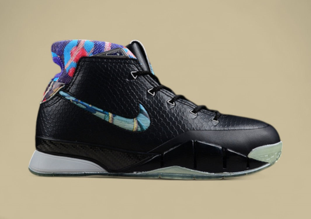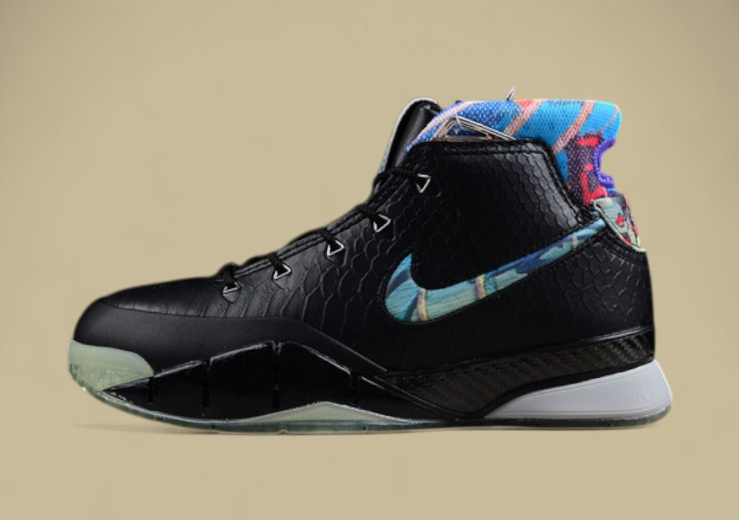 Replica-Kobe mit schwarzer Snake-Textur, buntem Kragen und grauer Sohle. Stilvoll, beweglich und kraftvoll – für Spieler mit Charakter und Kreativität.