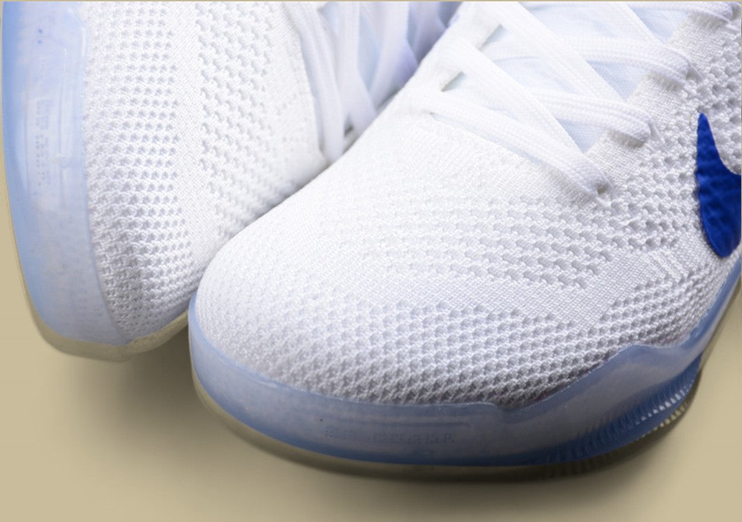 Leichter Replica-Kobe in Weiß-Blau mit atmungsaktivem Flyknit und Top-Dämpfung. Flexibel, schnell und stylisch – für dynamische Spielmacher.